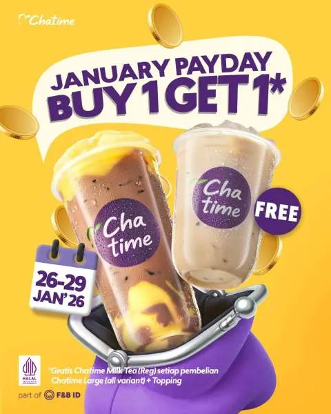 Selain itu, di momen gajian, Anda juga bisa menikmati promo Payday dari Chatime mulai 26-29 Januari 2026 saja. Ada penawaran Buy 1 Get 1 yang bikin momen gajian Anda makin manis.