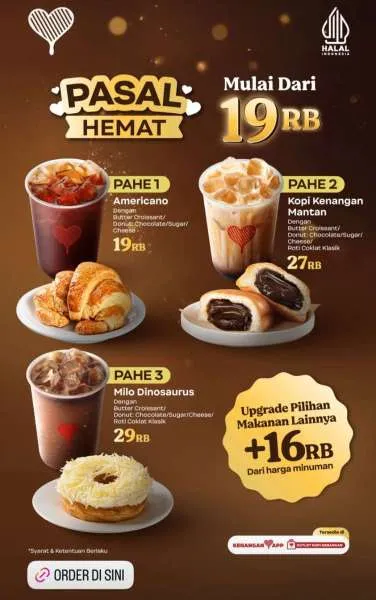 - Pahe 1 (Rp 19.000): Americano + Butter Croissant atau Donut Chocolate/Sugar/Cheese