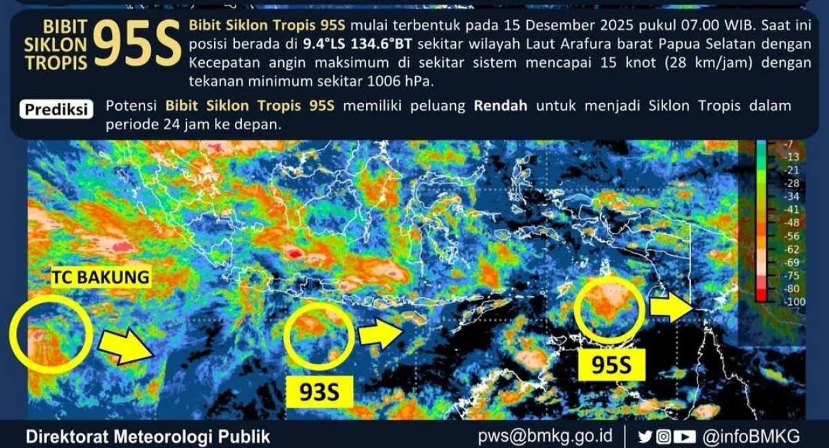 Bibit Siklon Tropis 95S yang berada di wilayah Laut Arafura barat Papua Selatan memiliki kecepatan angin maksimum sekitar 15 knot (28 km per jam) dan tekanan minimum 1006 hPa.