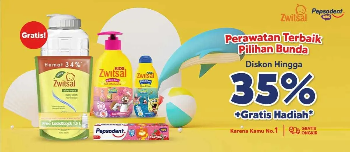Promo ini menawarkan Diskon 35% + Gratis Hadiah untuk beragam produk body care anak dari merek Zwitsal dan Pepsodent Kids.