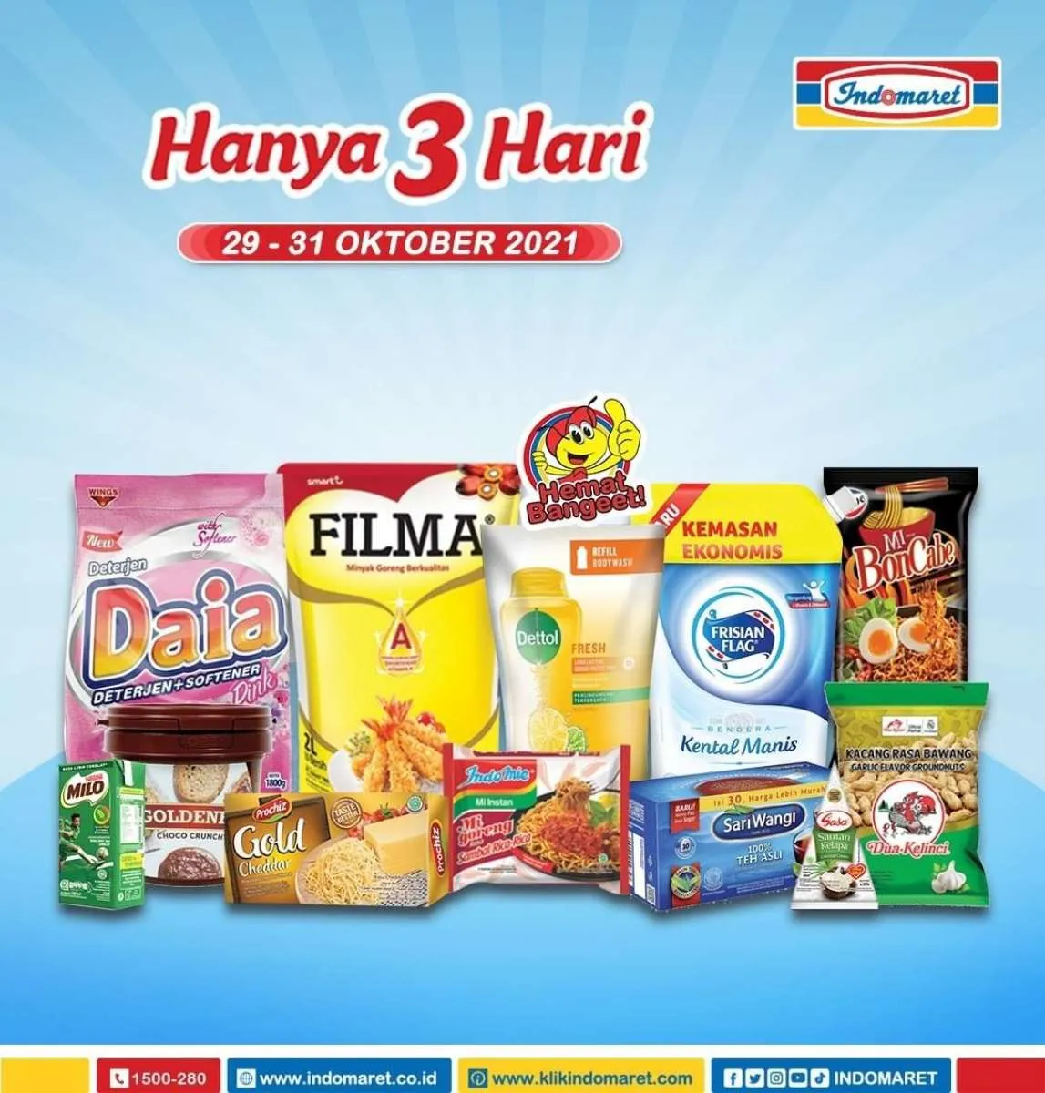 Melansir instagram Indomaret (@indomaret), inilah katalog Promo Indomaret Hanya 3 Hari Periode 29-31 Oktober 2021: