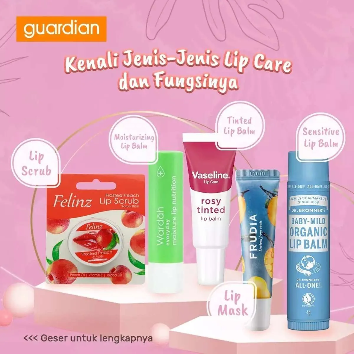 Untuk Moms yang sedang mencari lip balm, kebetulan di Guardian sedang ada promo untuk produk-produk lip care yang meliputi lip balm, lip scrub, dan lip mask.