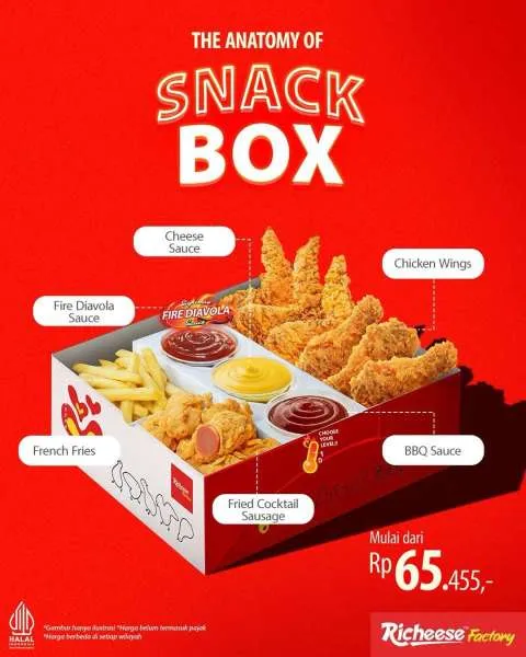 Selain itu, Richeese Factory juga menyediakan paket Snack Box dengan isian yang beragam dan nikmat dengan harga Rp 65.000-an saja. Cocok banget buat ngemil rame-rame.