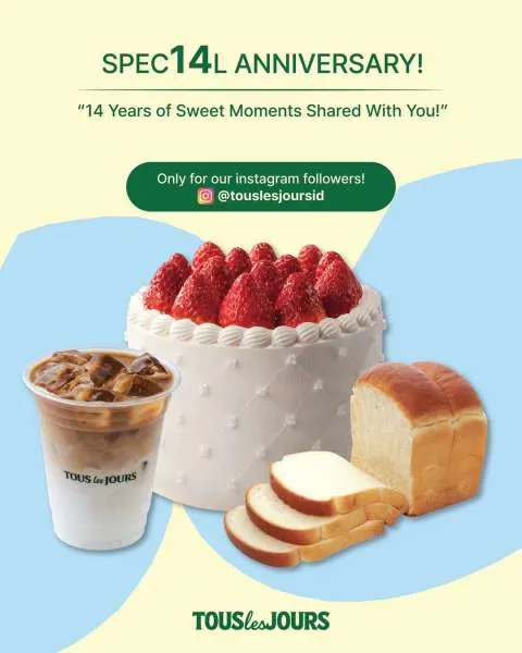 MOMSMONEY.ID - Merayakan ulang tahun Tous Les Jours ke-14, ada promo spesial hanya sehari saja di tanggal 14 November 2025. Anda bisa menikmati produk apa saja di Tous Les Jours dengan diskon 40% lo.