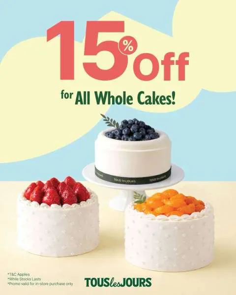 Selain itu, hari ini adalah kesempatan terakhir Anda untuk menikmati promo Payday di Tous les Jours. Anda bisa membawa pulang Whole Cake favorit dengan diskon 15%.