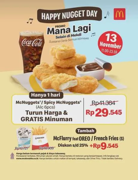 Dikutip dari Instagram McDonald's Indonesia, hanya dengan Rp 29.545, Anda sudah mendapatkan 6 pcs Nuggets/Spicy Nuggets + gratis Minuman, yang harga normalnya Rp 41.000-an. Hemat banget kan?