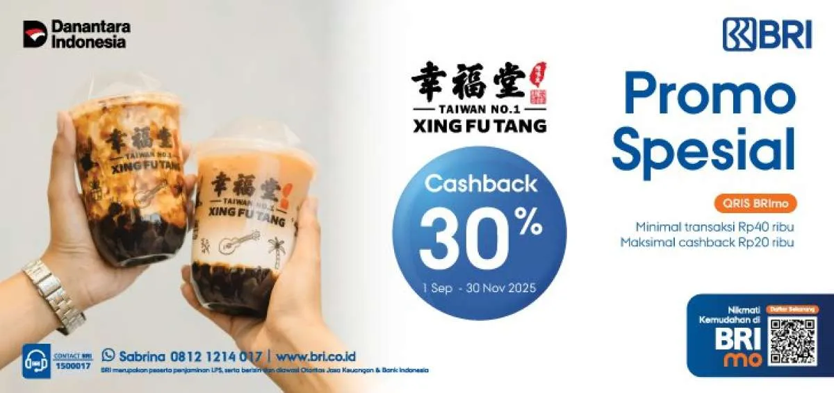 Selain itu, khusus pengguna BRI ada promo dengan cashback 30% mulai dari 1 September sampai 30 November 2025. Cashback tersebut bisa Anda dapatkan dengan minimal transaksi Rp 40.000 dan maksimal transaksi Rp 20.000 melalui QRIS BRImo.