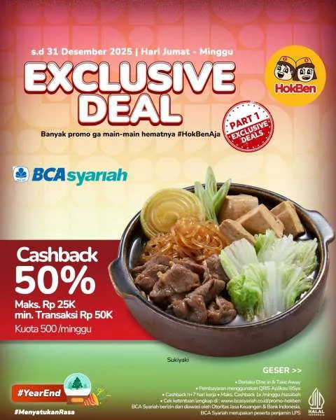 Selain itu, buat Anda pengguna BCA Syariah juga berkesempatan untuk menikmati promo spesial di HokBen. Ada cashback sampai 50% tiap weekend lo.