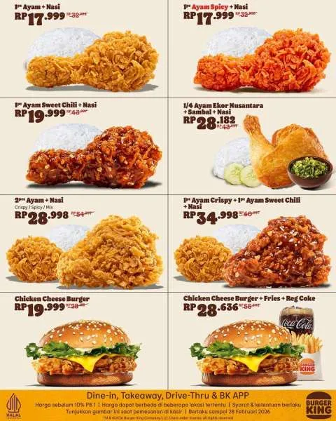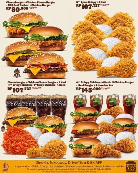Promo berlaku untuk layanan dine-in, take away, drive thru, dan BK App sampai 28 Februari 2026. Harga tersebut bisa berbeda di beberapa lokasi tertentu ya.