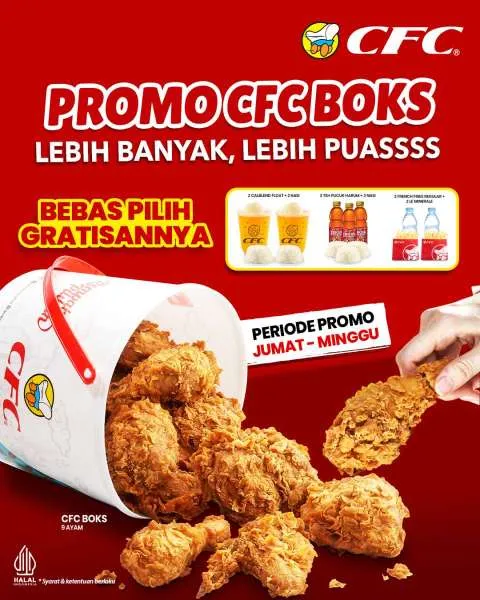 Selain itu, jangan lupa kalau di CFC juga ada promo CFC Boks setiap Jumat-Minggu. Anda bisa menikmati ayam goreng sepuasnya dengan harga lebih hemat dan dapatkan bonus menu spesialnya.