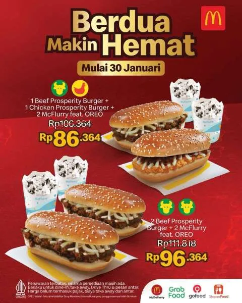 Selain itu, McD juga mengeluarkan promo terbarunya Berdua Makin Hemat. Ada paket Prosperity Burger atau Chicken Prosperity untuk berdua yang dilengkapi dengan McFlurry feat. Oreo.
