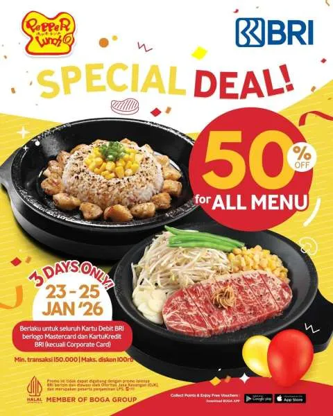 MOMSMONEY.ID - Kabar gembira untuk pecinta Pepper Lunch. Ada promo Special Deal menggunakan BRI yang berikan diskon hingga 50% untuk menikmati menu apa saja, lo.