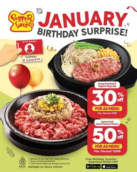 Selain itu, Anda juga bisa menikmati promo spesial lainnya di Pepper Lunch. Ada promo January Birthday Surprise yang berikan diskon hingga 50%.