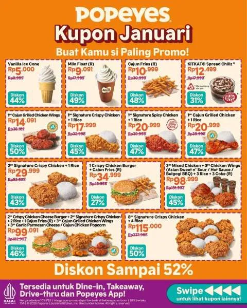 Dikutip dari Instagram @popeyes_indo, berikut menu-menu andalan di promo Kupon Januari 2026 yang bisa Anda nikmati dengan diskon spesial: