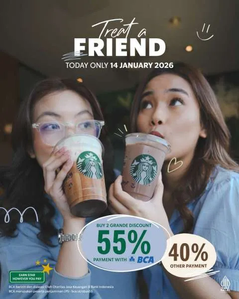 MOMSMONEY.ID - Hari Rabu terasa lebih menyenangkan dengan momen ngopi bareng di Starbucks. Melalui promo Starbucks x BCA Treat a Friend khusus 14 Januari 2026, Anda bisa mendapatkan dua minuman spesial dengan diskon sampai 55% pakai BCA.