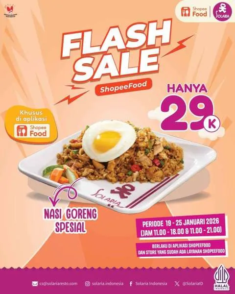 Dikutip dari Instagram @solaria.indonesia, melalui promo Flash Sale di ShopeeFood, Anda bisa mendapatkan Nasi Goreng Spesial dengan harga Rp 29.000 saja.