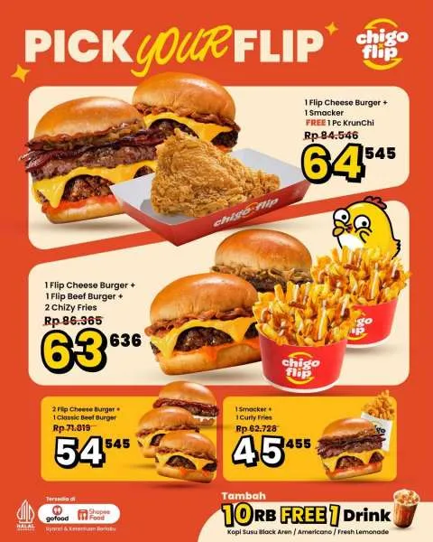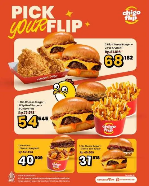 - 1 Flip Cheese Burger + 1 Flip Beef Burger + 2 ChiZy Fries (Rp 63.636)