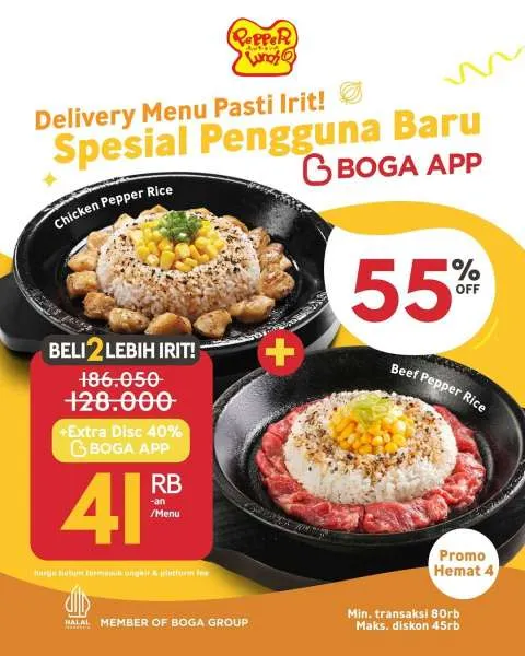 Selain itu, Pepper Lunch juga ada promo spesial lainnya khusus pengguna baru Boga App. Anda bisa dapat diskon sampai 55% lo.