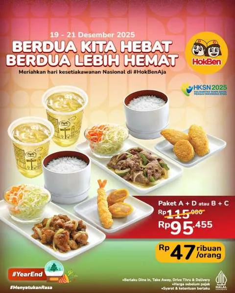 Dikutip dari Instagram @hokben_id, promo bertajuk Berdua Kita Hemat, Berdua Lebih Hemat ini menyediakan paket berdua berupa Paket A + D atau B + C hanya Rp 95.455 atau Rp 47.000-an per orang, dari harga normalnya Rp 115.000. Hemat banget kan? /2025/12/19/1835025320p.jpg)