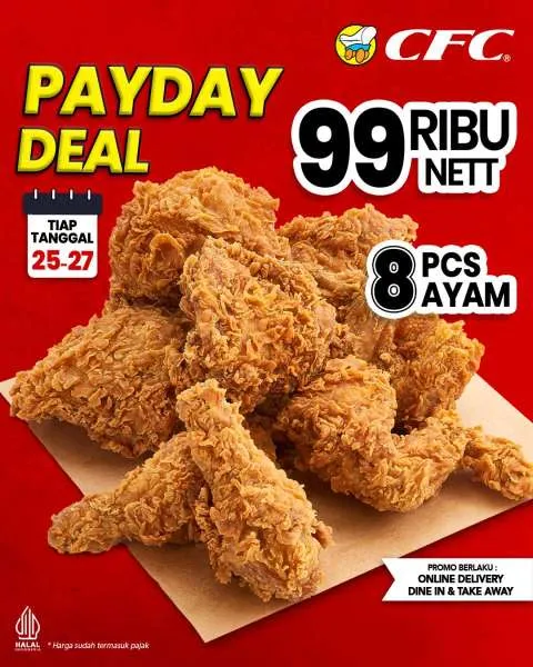 MOMSMONEY.ID -Hari ini adalah kesempatan terakhir Anda untuk berburu promo Payday Deal di CFC. Hanya dengan Rp 99.000, Anda sudah bisa mendapatkan 8 Ayam Goreng lezat dari CFC.