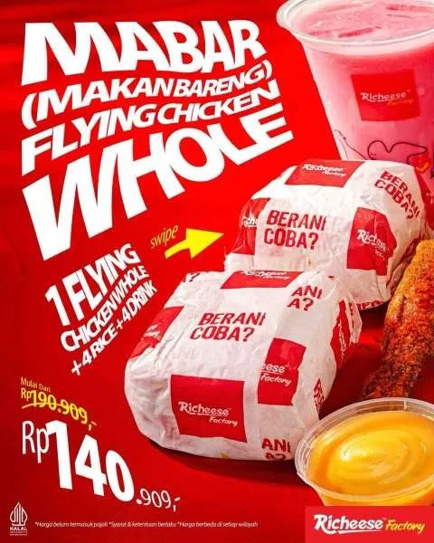 Selain itu, Richeese Factory juga ada promo Mabar Flying Chicken Whole dengan harga lebih hemat. Nikmati paket Flying Chicken dengan 4 nasi dan 4 minuman mulai Rp 140.000-an saja.