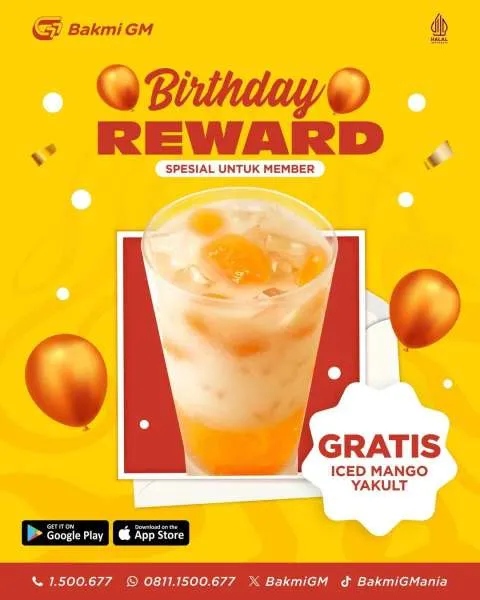 Selain itu, Bakmi GM juga ada promo Birthday Reward untuk Anda yang sedang berulang tahun. Ini kesempatan Anda untuk mendapatkan Iced Mango Yakult gratis lo.