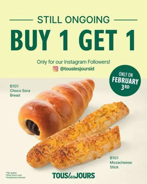 Dikutip dari Instagram @touslesjoursid, khusus di tanggal 3 Februari 2026, Anda bisa menikmati promo Buy 1 Get 1 berupa Choco Sora Bread dan Mozacheese Stick. /2026/02/03/2056925517p.jpg)