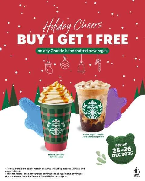 MOMSMONEY.ID - Di momen Natal ini, Starbucks hadir dengan promo Holiday Cheers yang terbatas banget. Hari ini adalah kesempatan terakhir Anda untuk menikmati penawaran Buy 1 Get 1 Free minuman favorit di Starbucks.