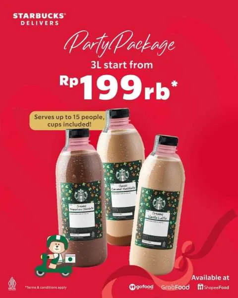 Lalu, buat Anda yang mau merayakan tahun baru dengan lebih seru pakai yang segar-segar, pesan minuman di Starbucks saja. Ada promo Party Package dengan bundling tiga liter minuman yang hemat banget.