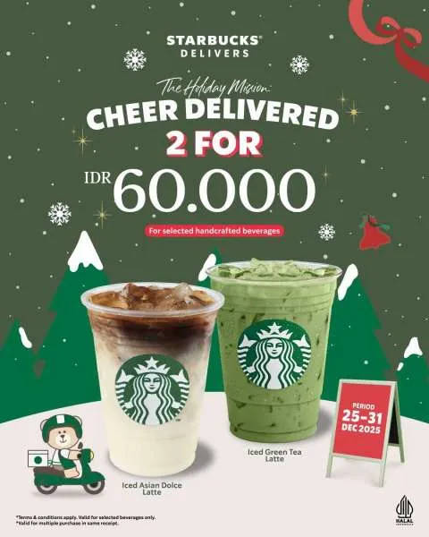 Selain itu, Starbucks juga ada promo The Holiday Mission Cheer Delivered. Anda bisa pesan minuman favorit di Starbucks dengan praktis secara online. Bahkan, ada harga spesialnya yang lebih hemat lo.