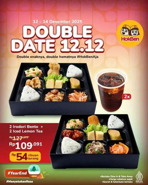Merayakan momen 12.12, HokBen hadir dengan paket hematnya untuk makan berdua. Tersedia menu Bento spesial praktis dan lengkap yang dijamin bikin puas, sudah lengkap dengan minuman segarnya.
