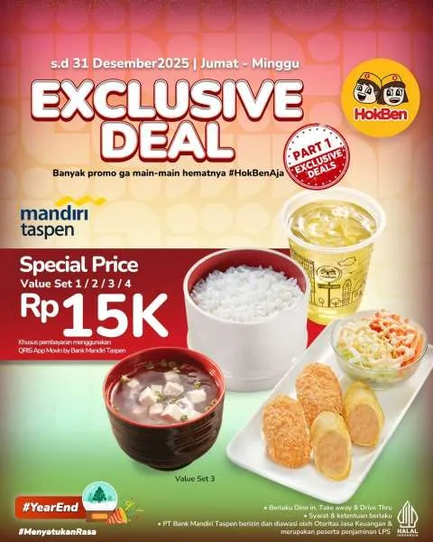 Selain itu, HokBen juga ada promo spesial yang bisa Anda nikmati dengan hemat menggunakan Mandiri Taspen. Hanya dengan Rp 15.000 Anda bisa mendapatkan Value Set selama Desember 2025.