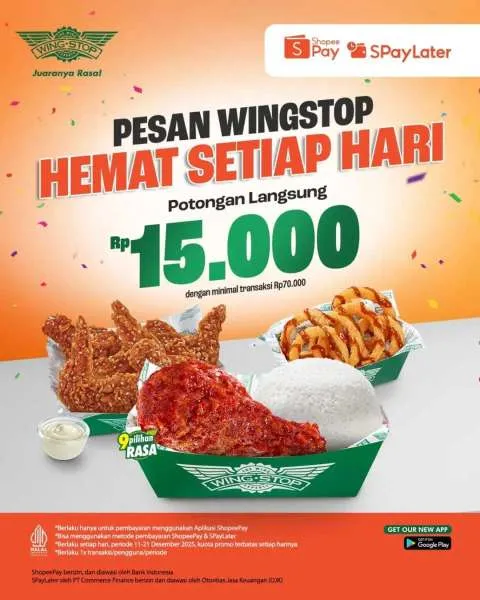 Selain itu, Wingstop juga lagi ada promo spesial dengan ShopeePay SPayLater hingga 21 Desember 2025. Anda bisa dapat diskon Rp 15.000 untuk menikmati ayam goreng favorit.