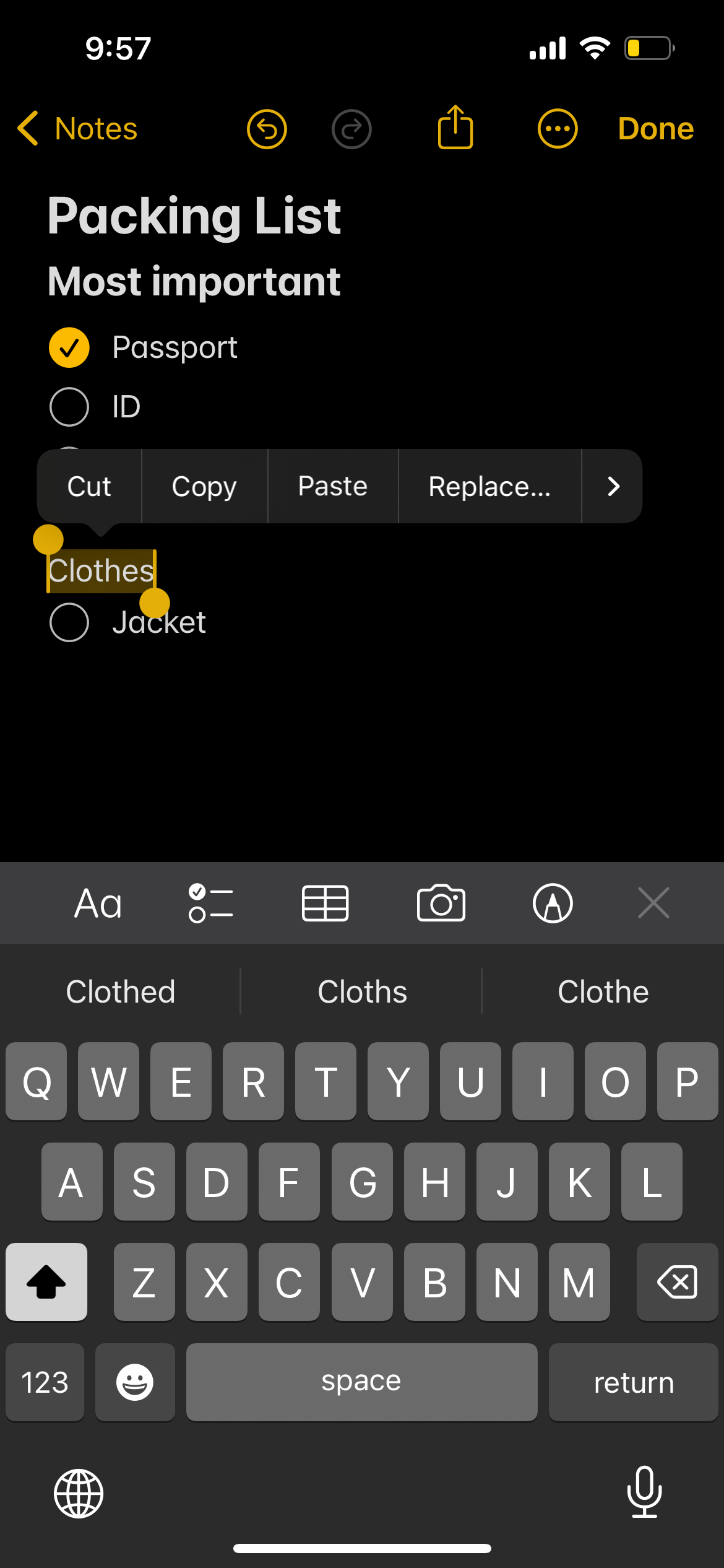 Untuk memulai daftar periksa di Catatan, ketuk ikon daftar periksa (di sebelah Aa) saat mengetik catatan. Kapan pun Anda ingin menambahkan item baru ke daftar, ketuk Kembali di papan ketik iPhone Anda.