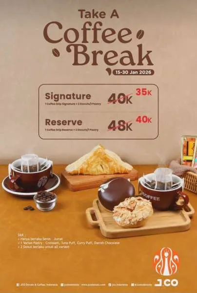 Selain itu, J.CO juga ada penawaran spesial lainnya berupa Take A Coffee Break. Ada paket ngopi dengan camilan favorit yang siap menemani hari-hari Anda setiap Senin-Jumat selama Januari 2026.