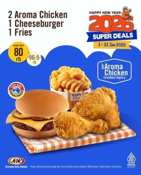 Dikutip dari Instagram @awrestoranid, dalam paket ini, Anda akan mendapatkan 2 Aroma Chicken + 1 Cheeseburger + 1 Fries, mulai Rp 80.000, dari harga normalnya Rp 96.000-an. /2026/01/01/1047760163p.jpg)