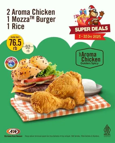 Selain itu, A&W juga ada promo Couple Meal yang bisa Anda nikmati setiap hari selama Desember 2025 lo. Ada paket Aroma Chicken, Mozza Burger, dan Nasi mulai Rp 76.000-an saja.