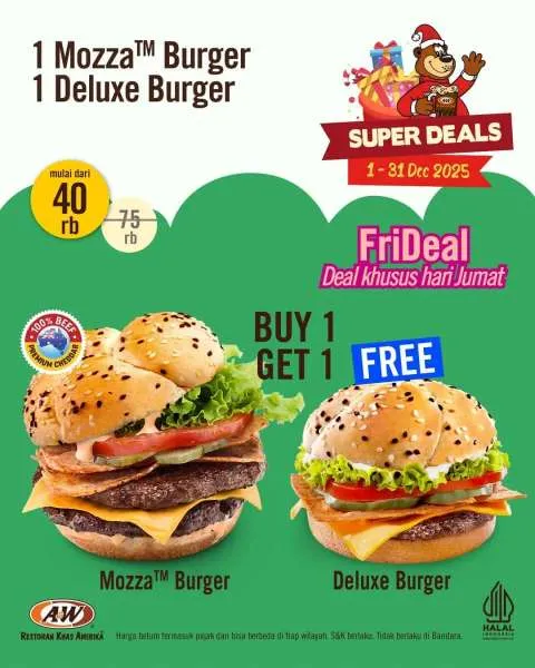 MOMSMONEY.ID - Yuk, bikin Jumat Anda lebih nikmat dan hemat dengan promo FriDeal dari A&W! Ada penawaran Buy 1 Get 1 Free Burger spesial mulai Rp 40.000 saja selama Desember 2025.