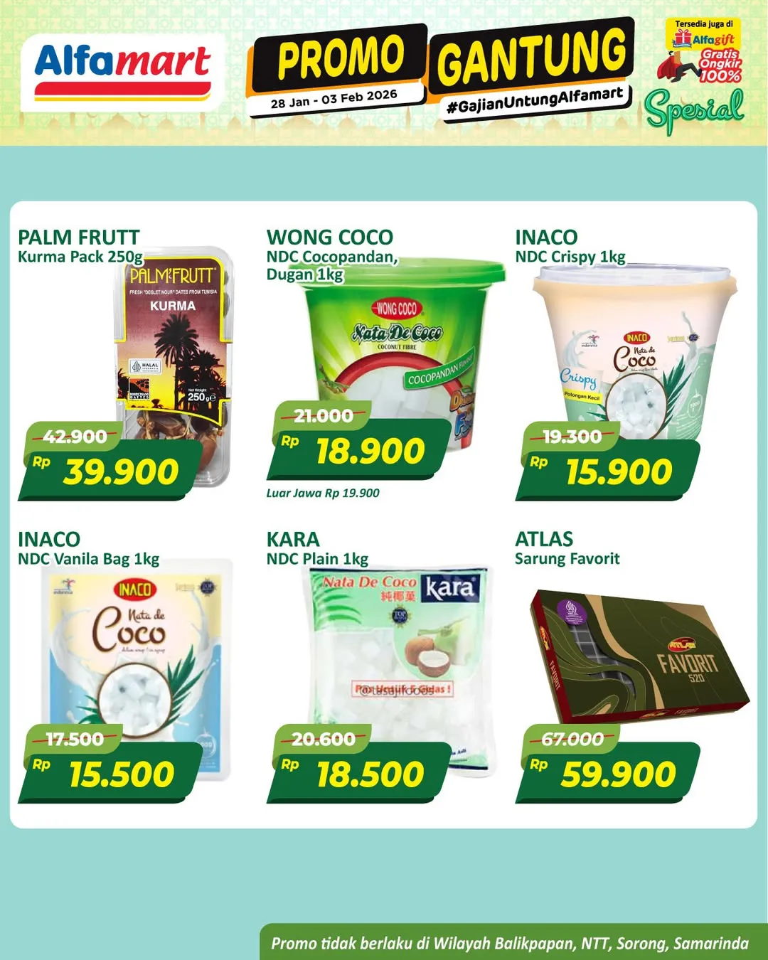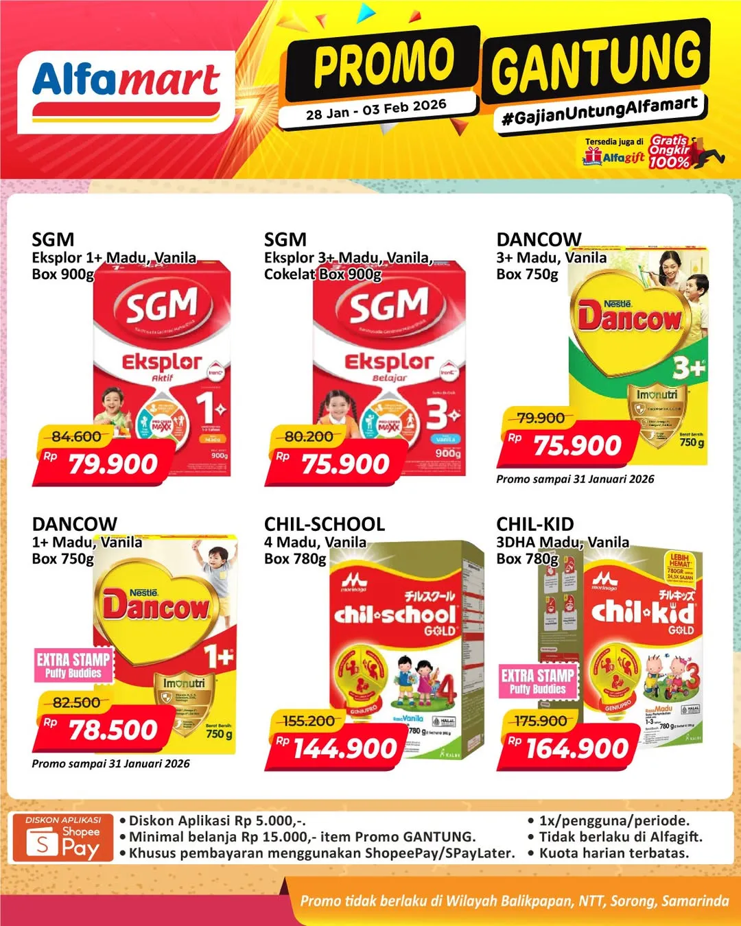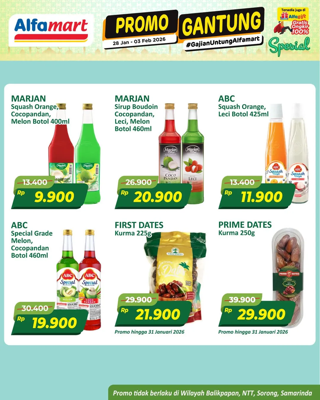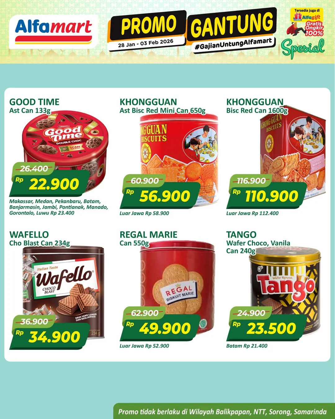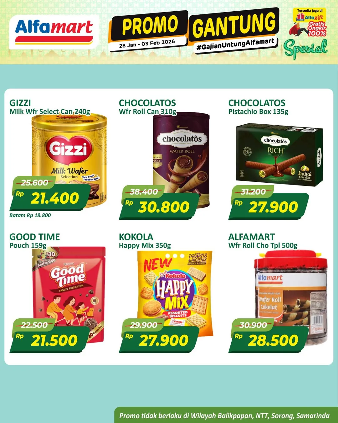 Harga promo Alfamart Gantung periode 28 Januari-3 Februari 2026 tidak berlaku di wilayah NTT, Balikpapan, Samarinda, dan Sorong ya Moms.
