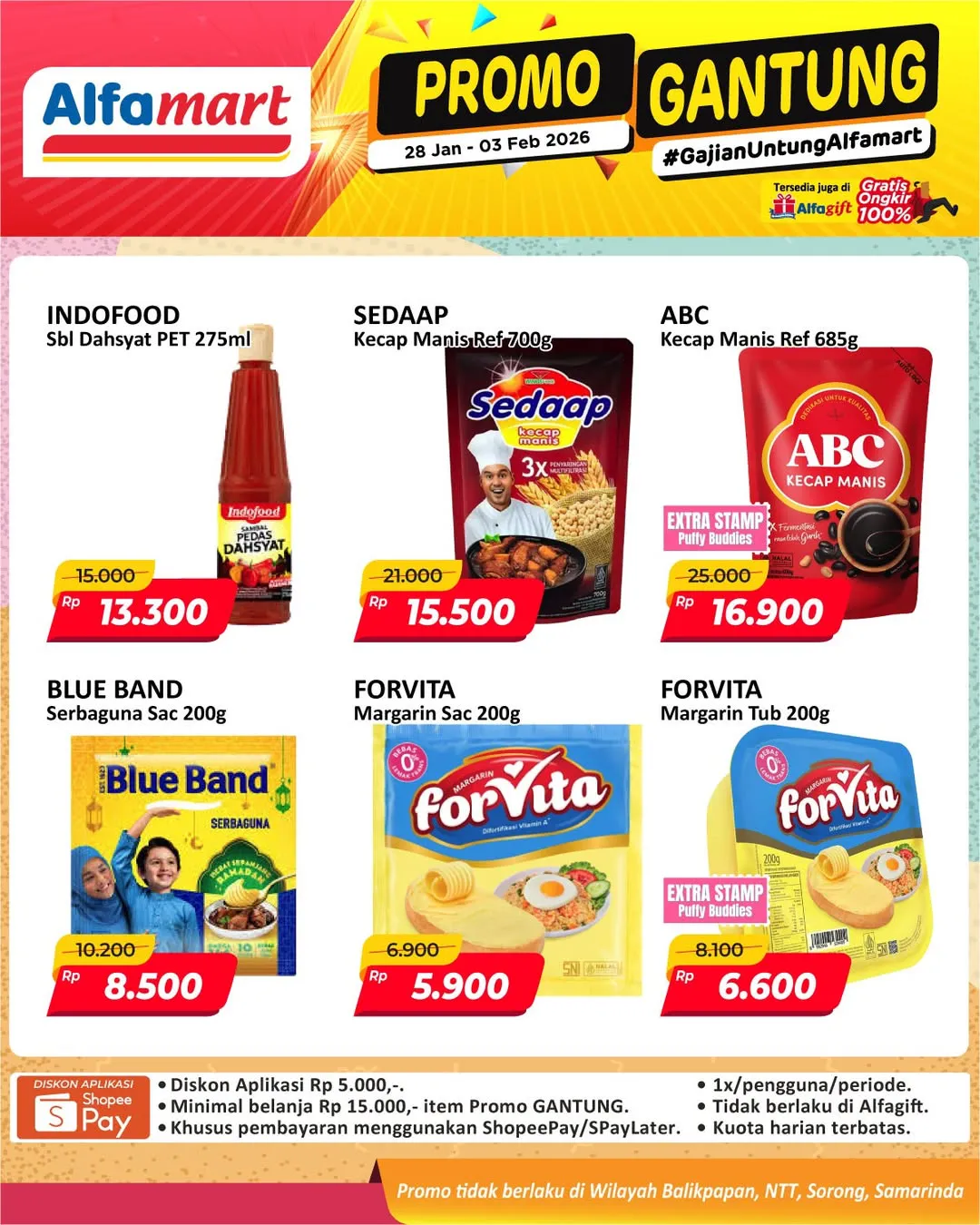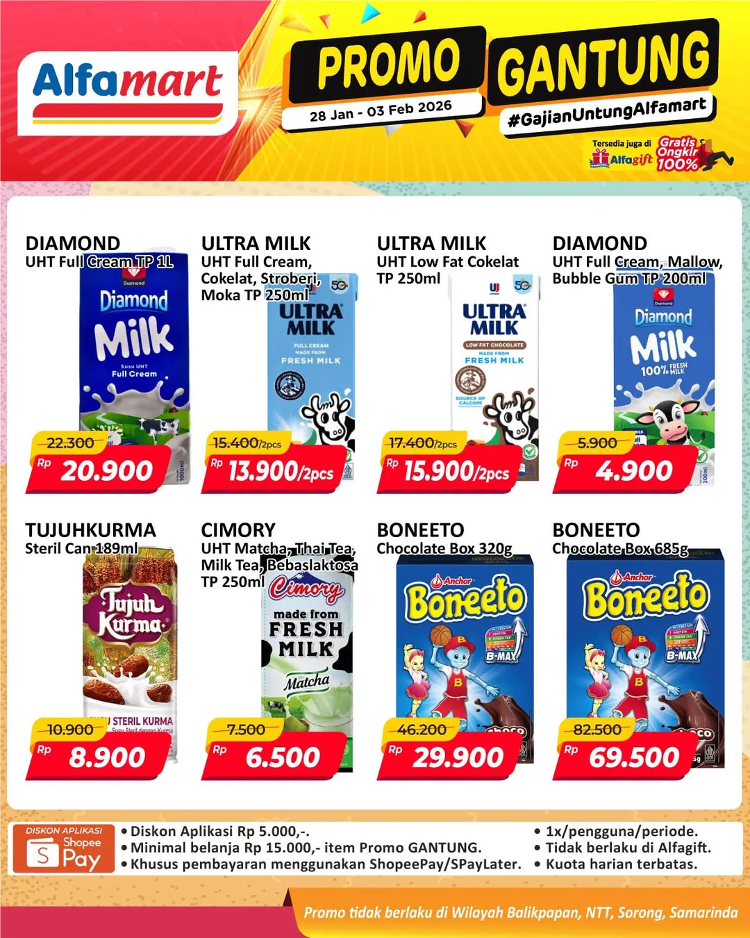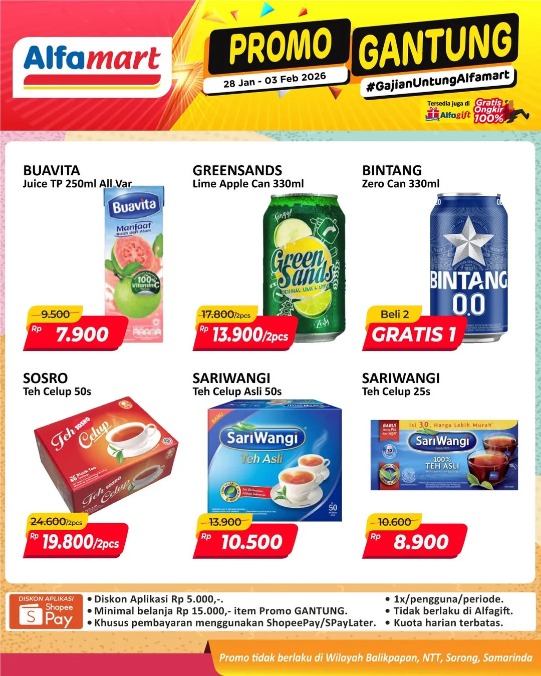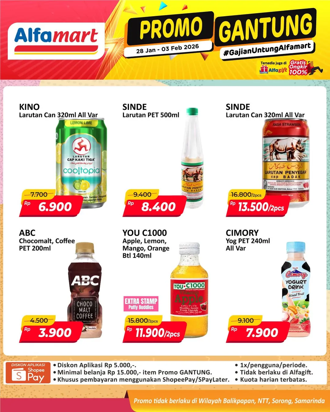 Harga promo Alfamart Gantung periode 28 Januari-3 Februari 2026 tidak berlaku di wilayah NTT, Balikpapan, Samarinda, dan Sorong ya Moms.