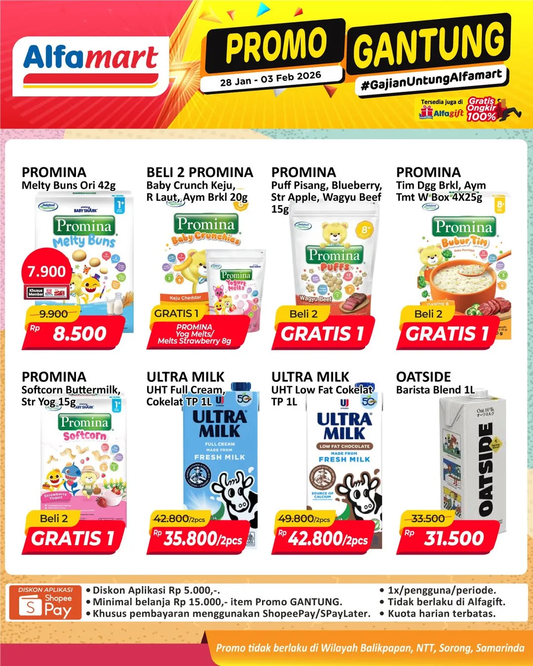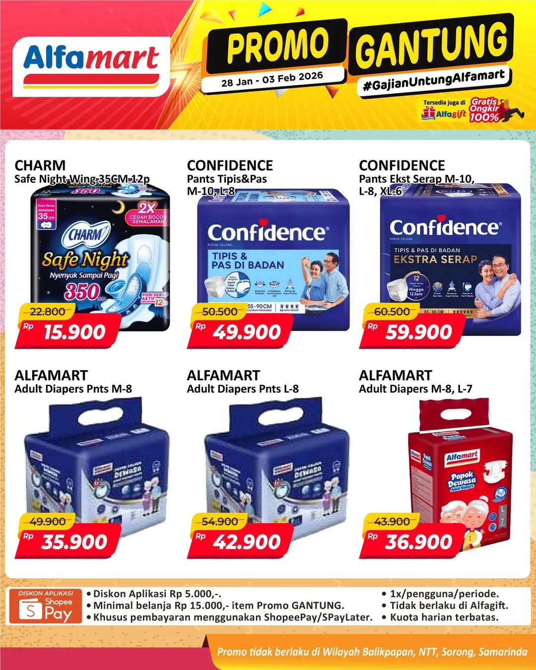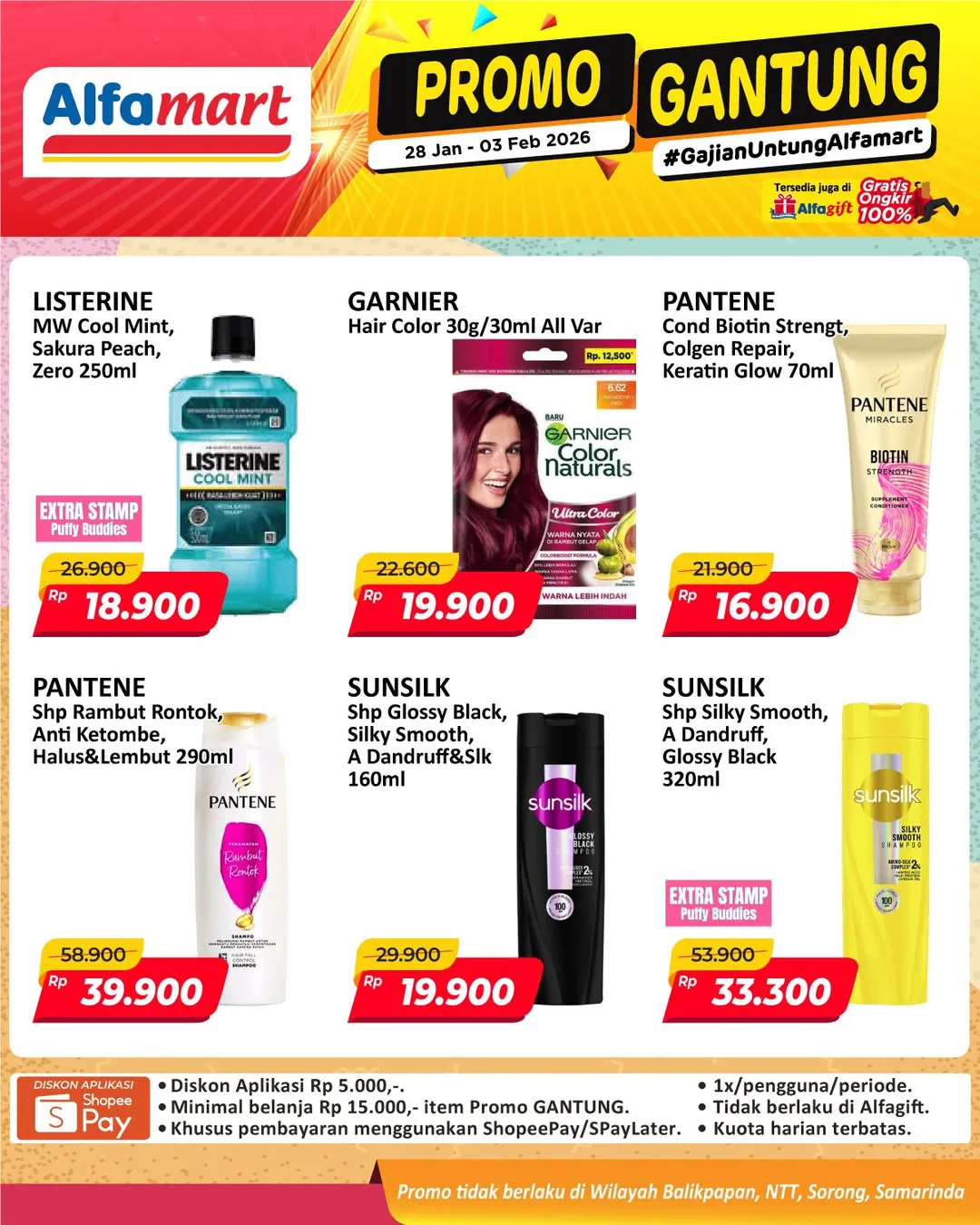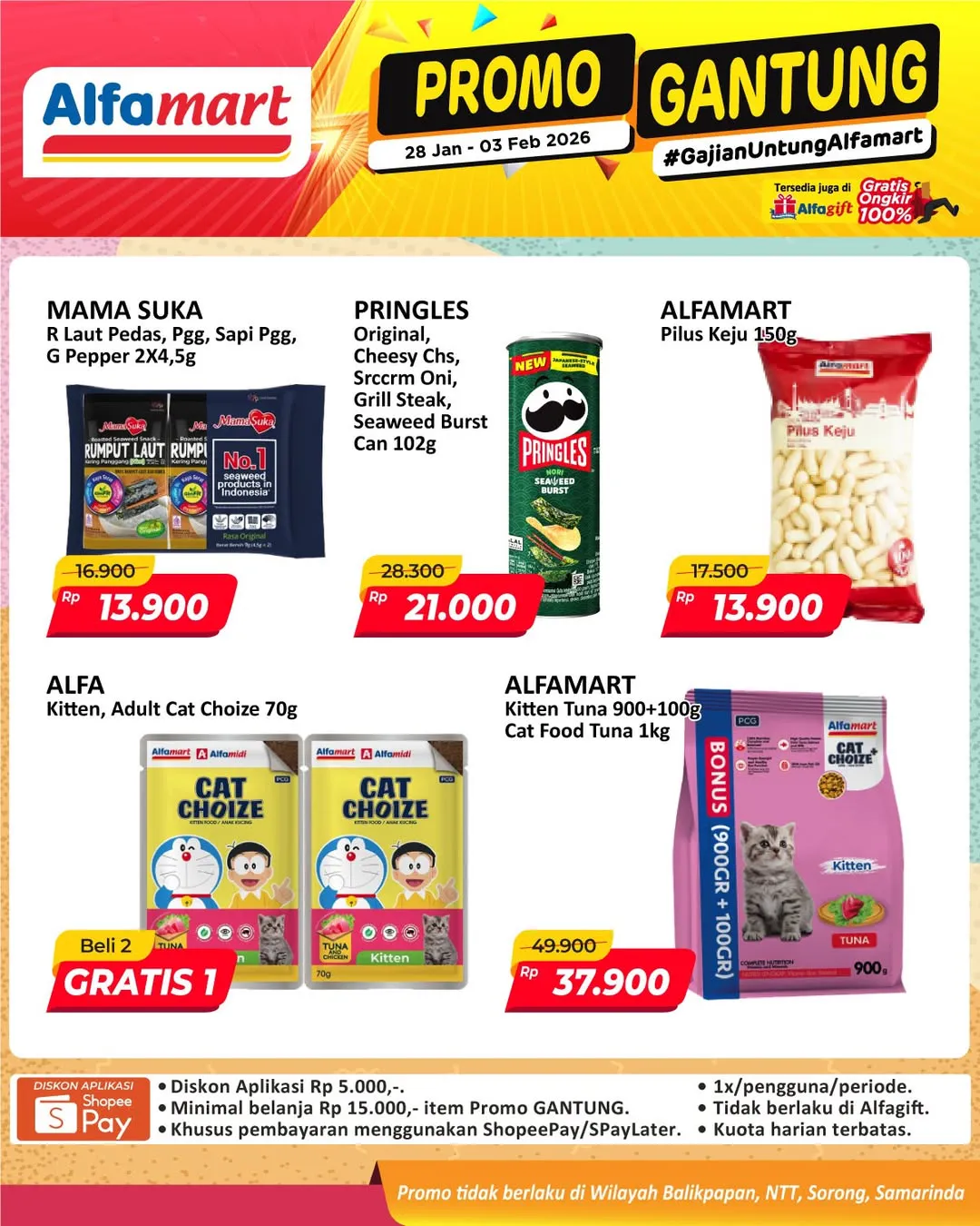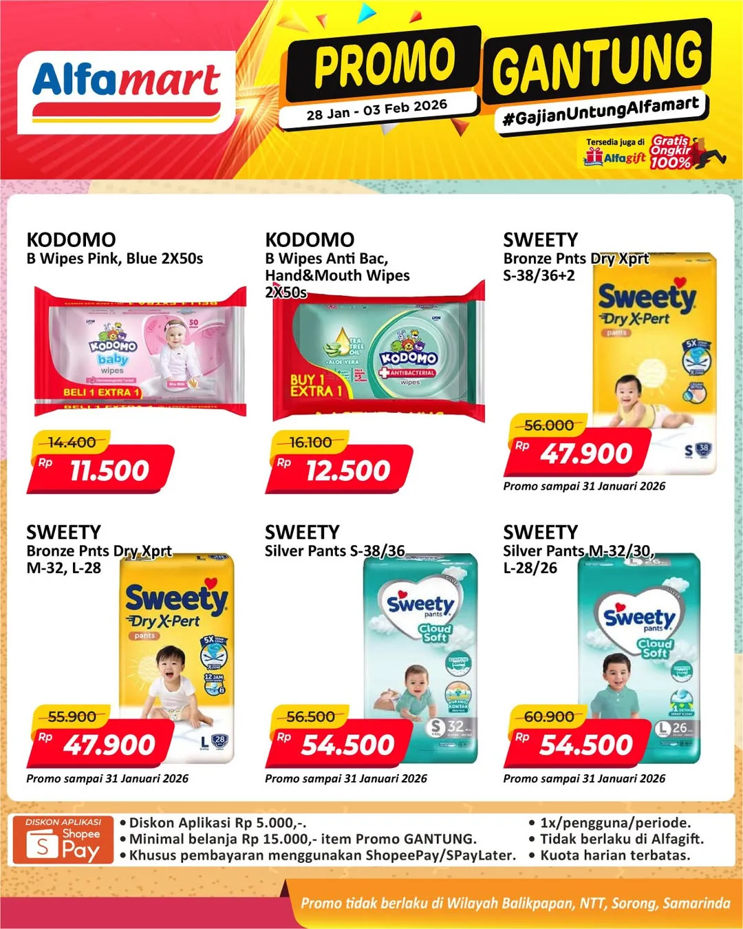 Harga promo Alfamart Gantung periode 28 Januari-3 Februari 2026 tidak berlaku di wilayah NTT, Balikpapan, Samarinda, dan Sorong ya Moms.
