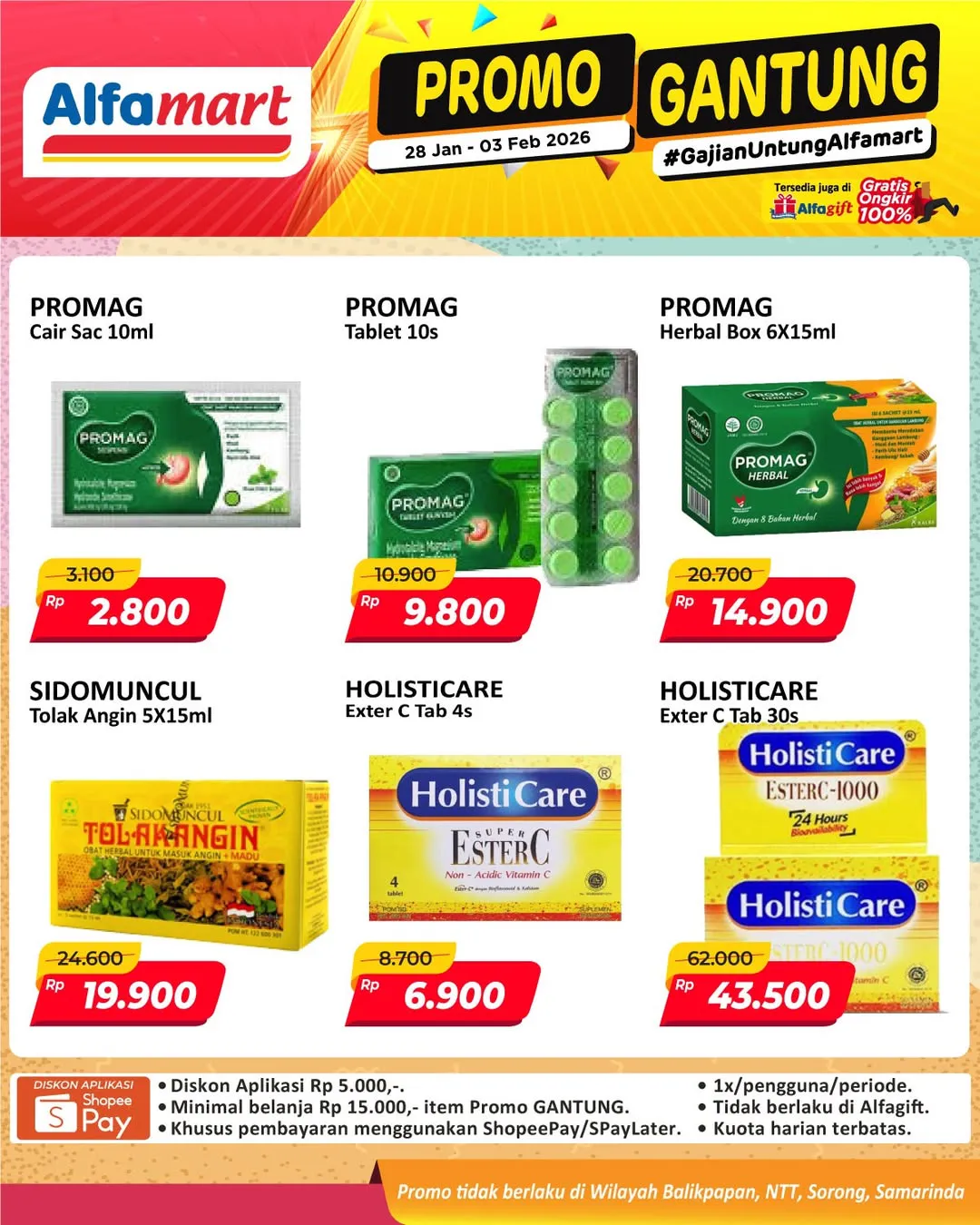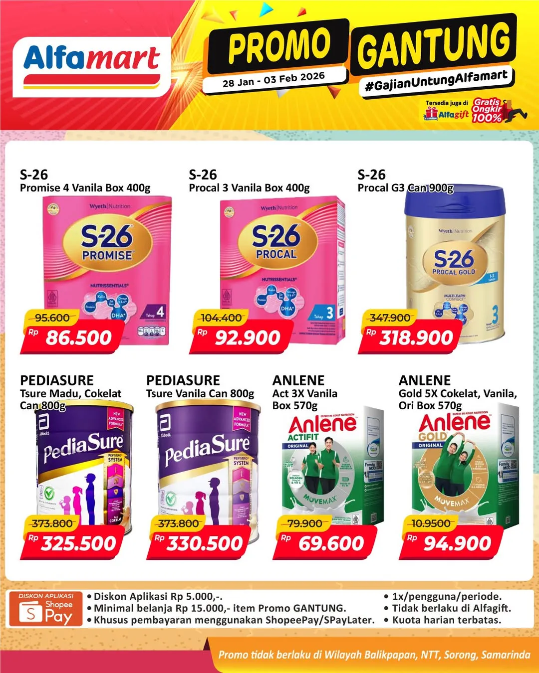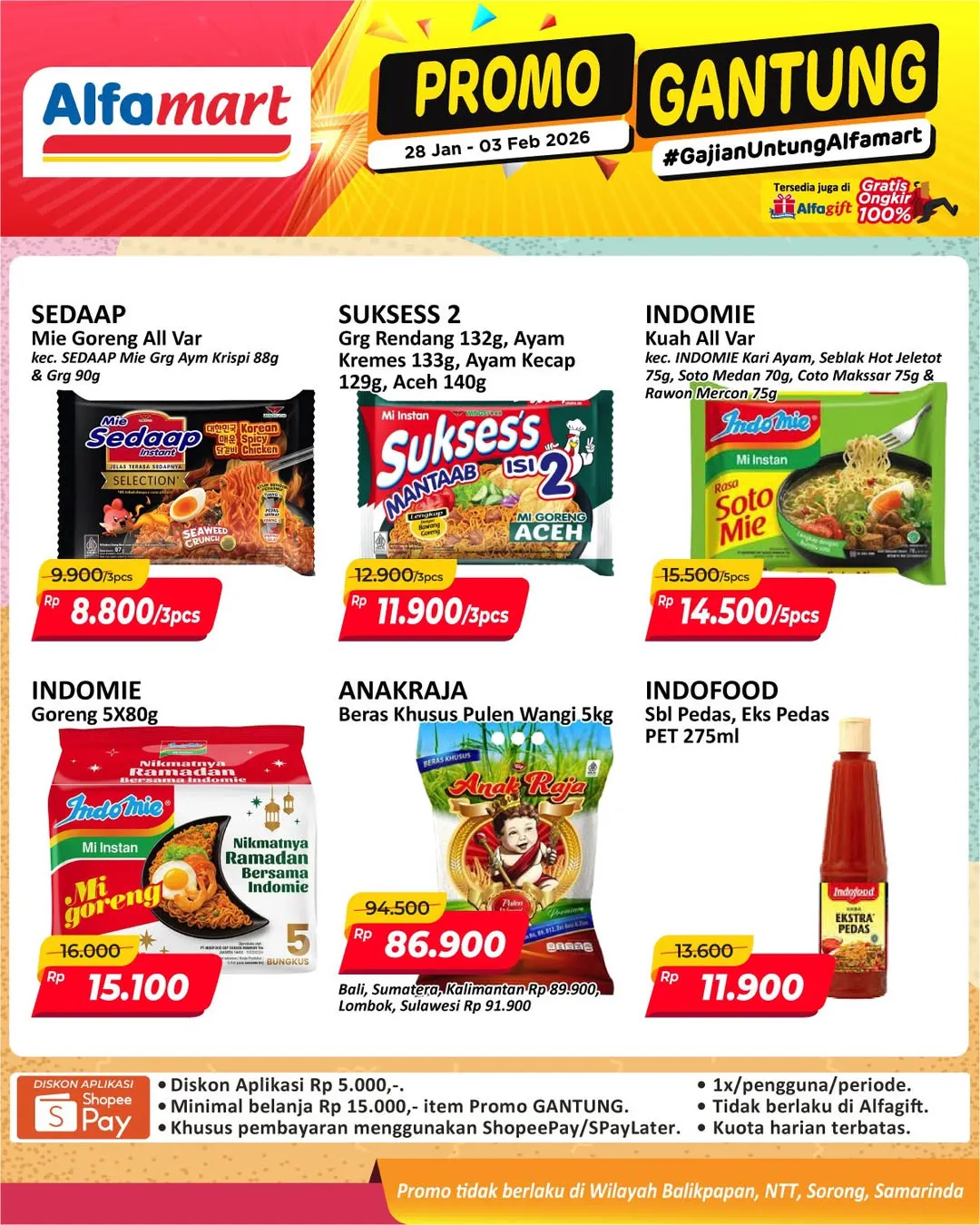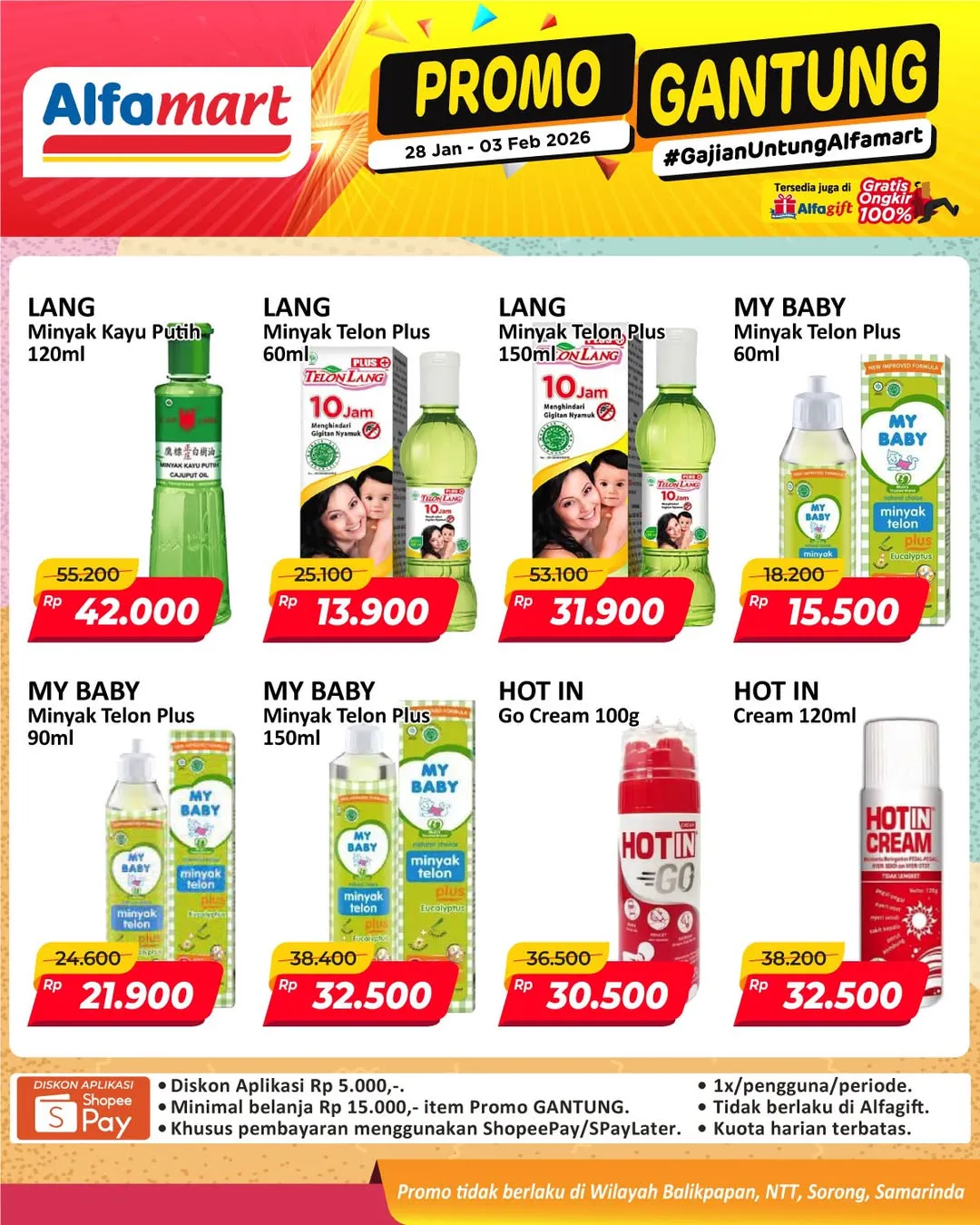 Harga promo Alfamart Gantung periode 28 Januari-3 Februari 2026 tidak berlaku di wilayah NTT, Balikpapan, Samarinda, dan Sorong ya Moms.