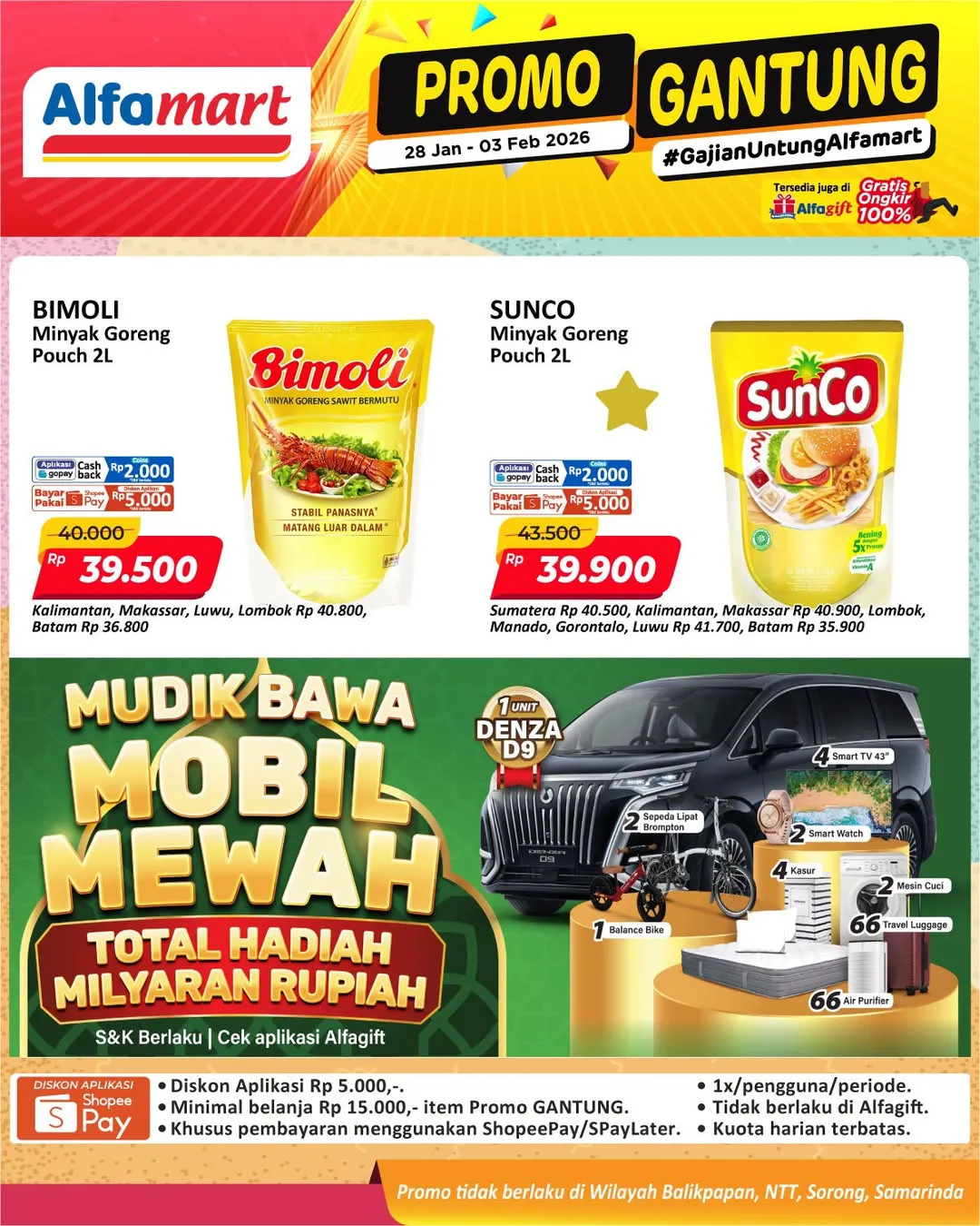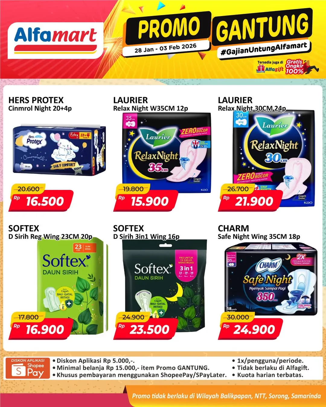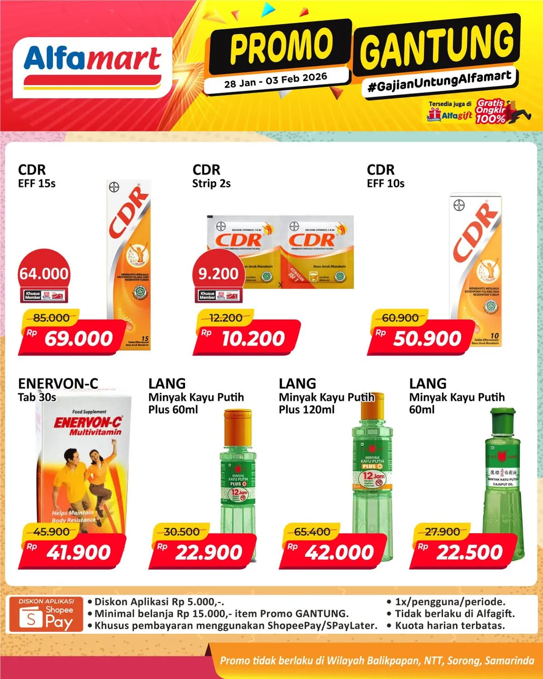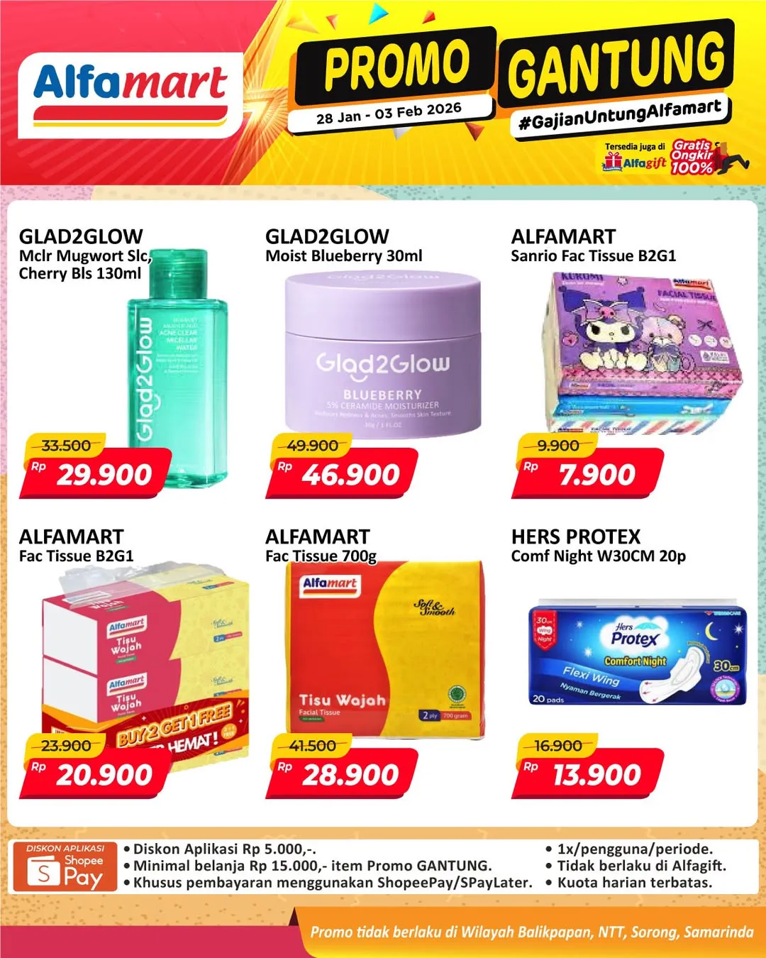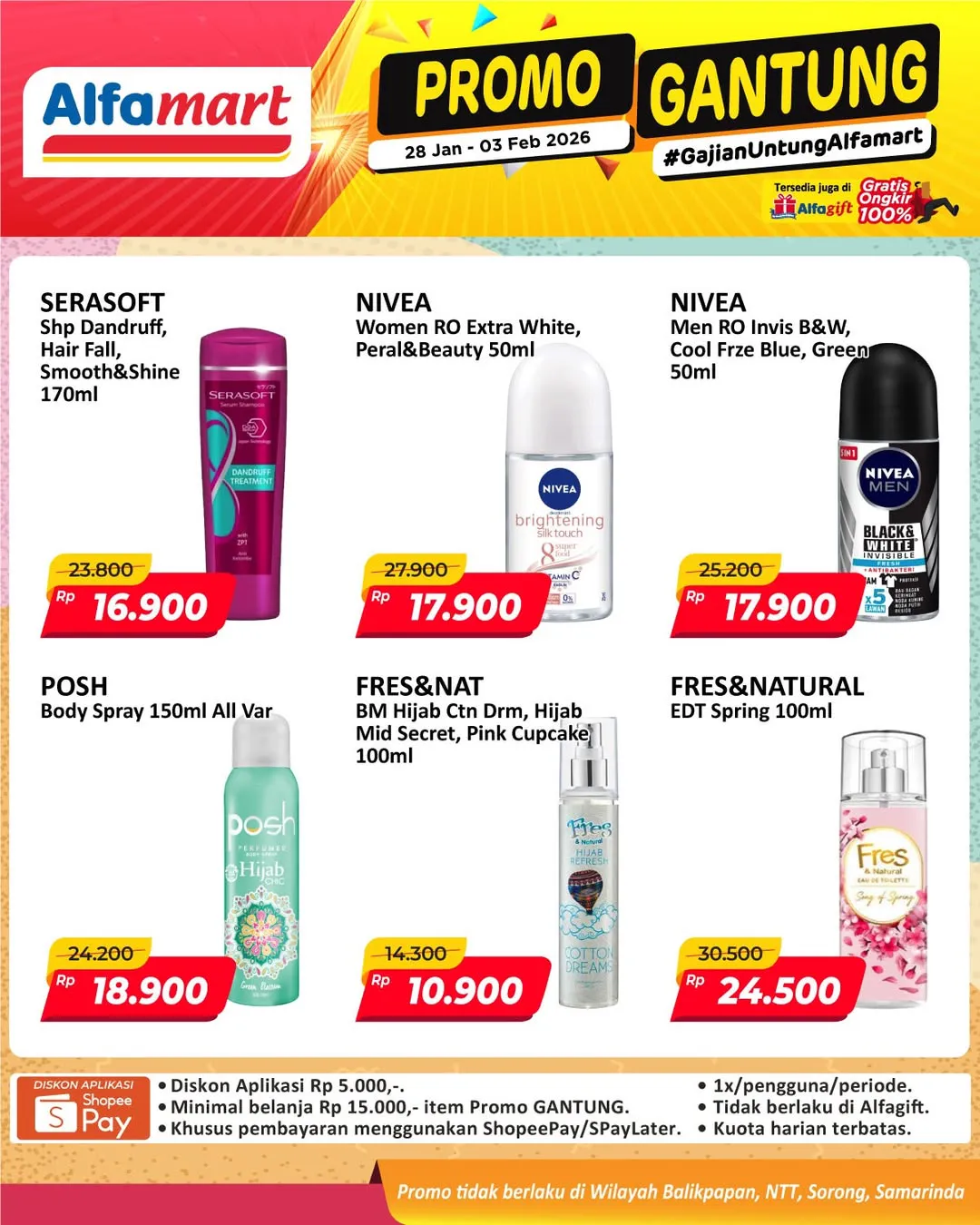 Harga promo Alfamart Gantung periode 28 Januari-3 Februari 2026 tidak berlaku di wilayah NTT, Balikpapan, Samarinda, dan Sorong ya Moms.