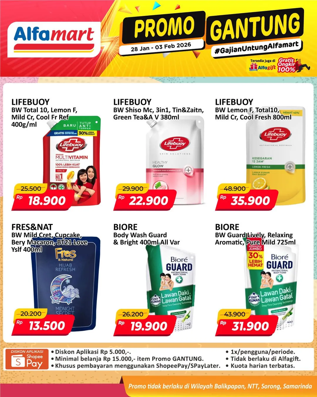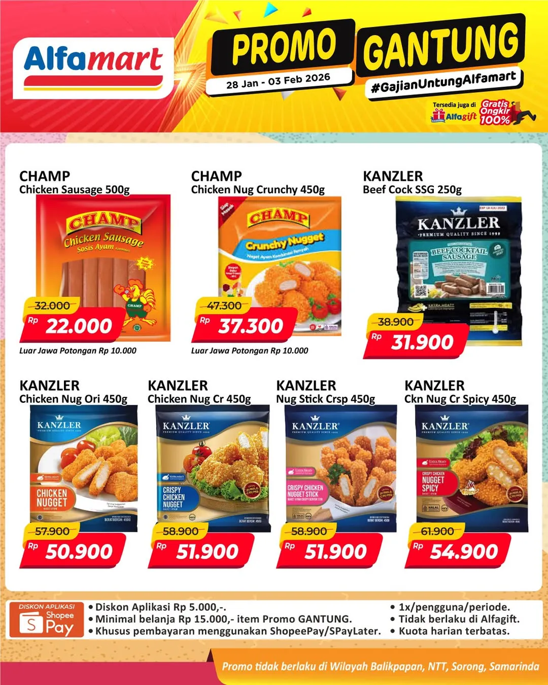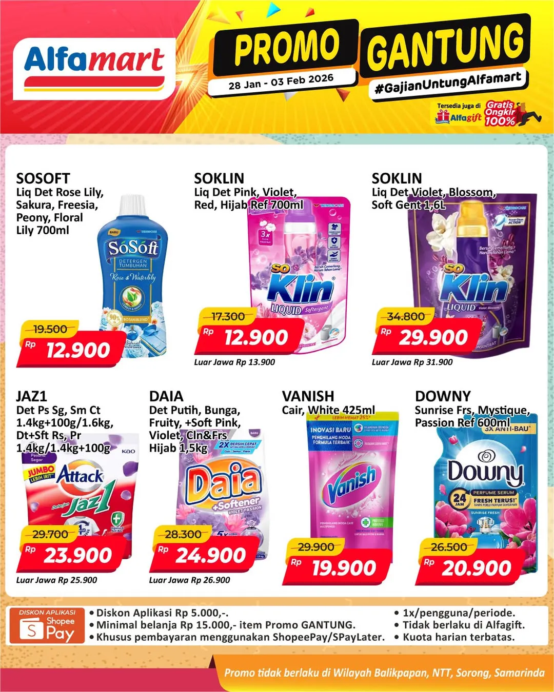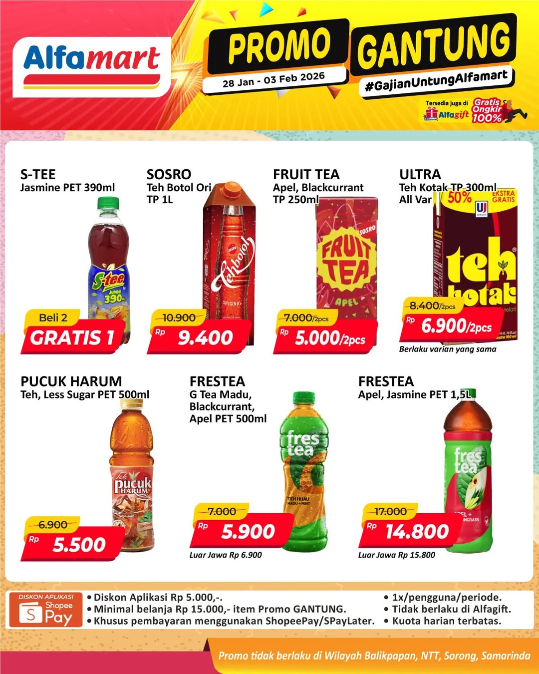 Harga promo Alfamart Gantung periode 28 Januari-3 Februari 2026 tidak berlaku di wilayah NTT, Balikpapan, Samarinda, dan Sorong ya Moms.