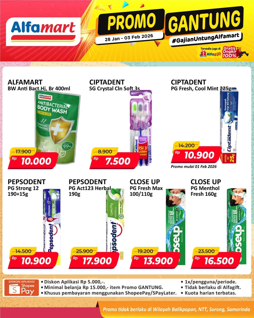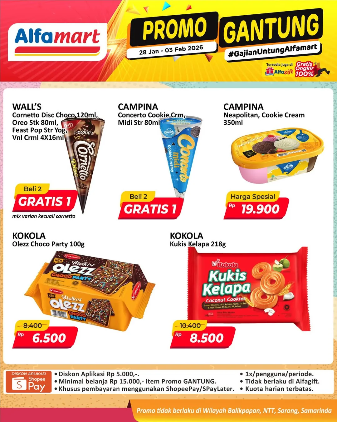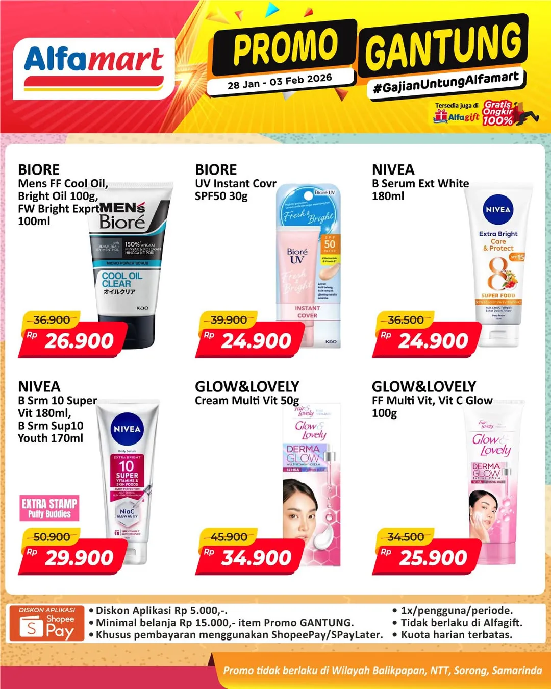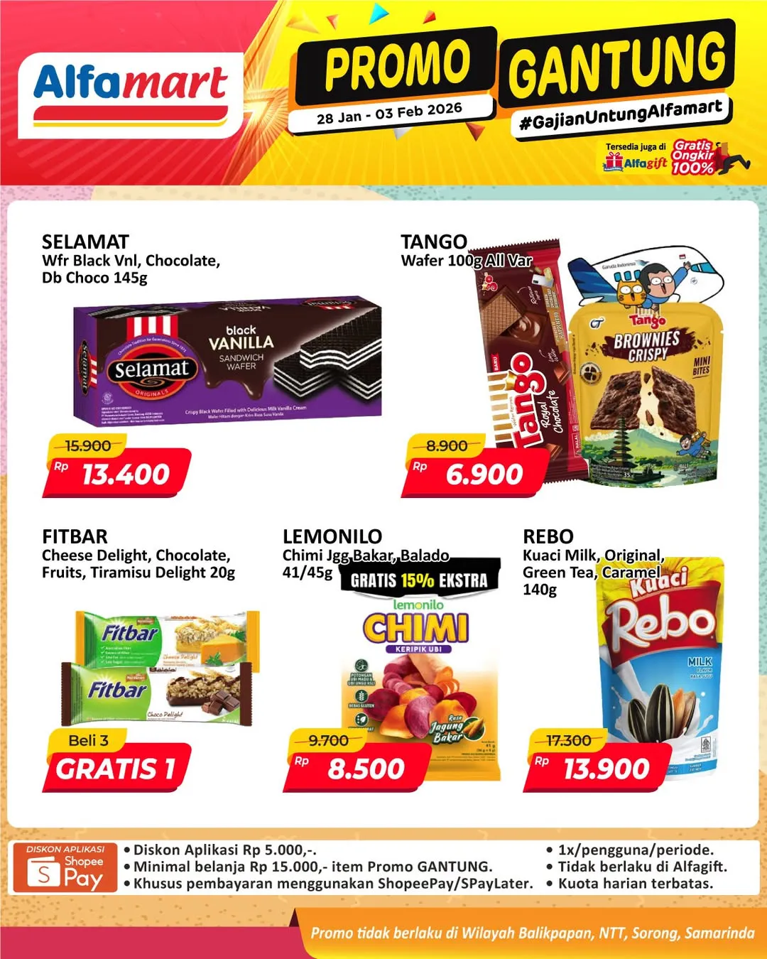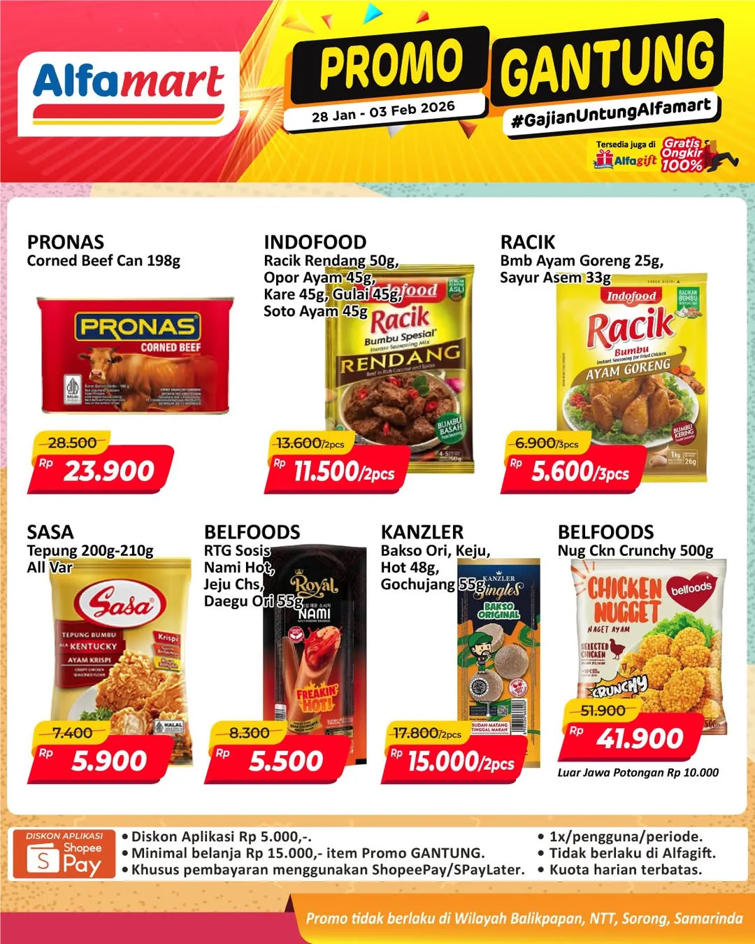 Harga promo Alfamart Gantung periode 28 Januari-3 Februari 2026 tidak berlaku di wilayah NTT, Balikpapan, Samarinda, dan Sorong ya Moms.