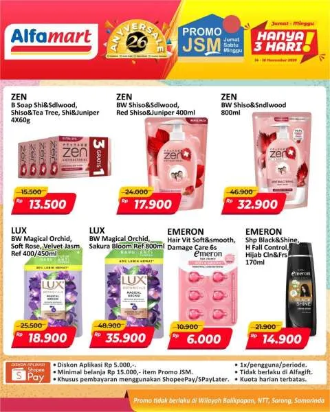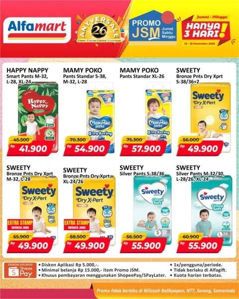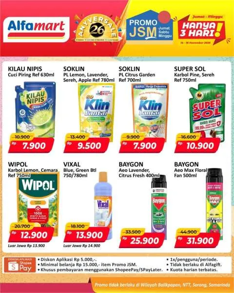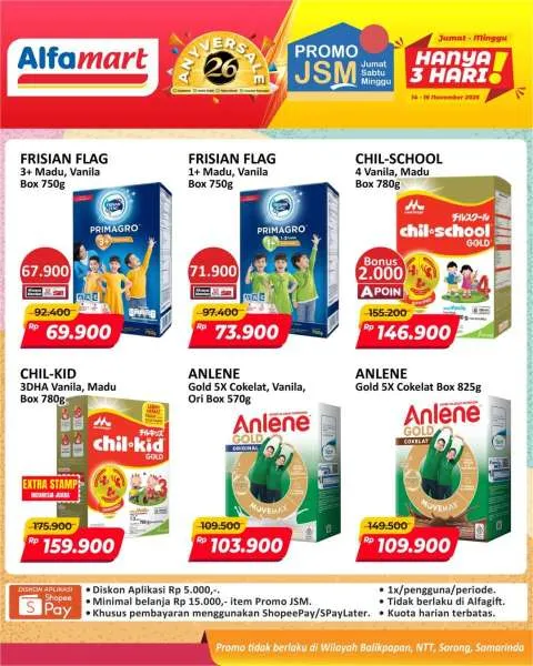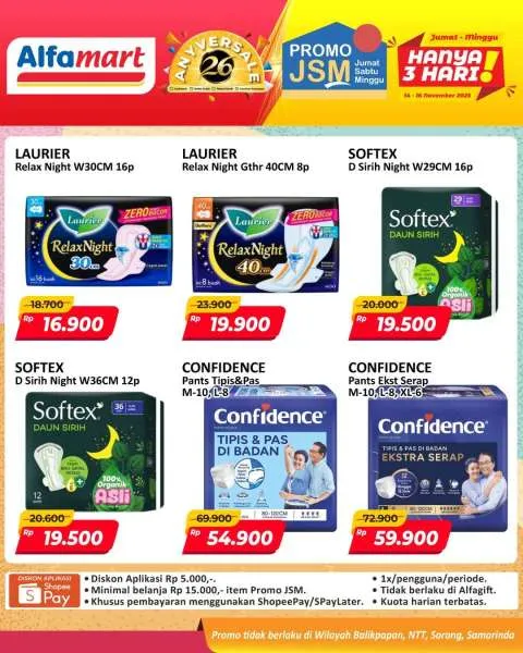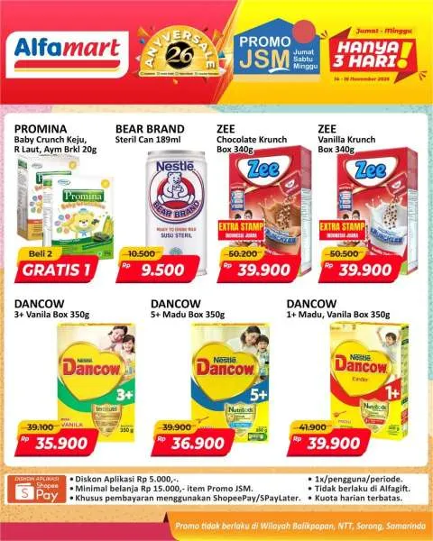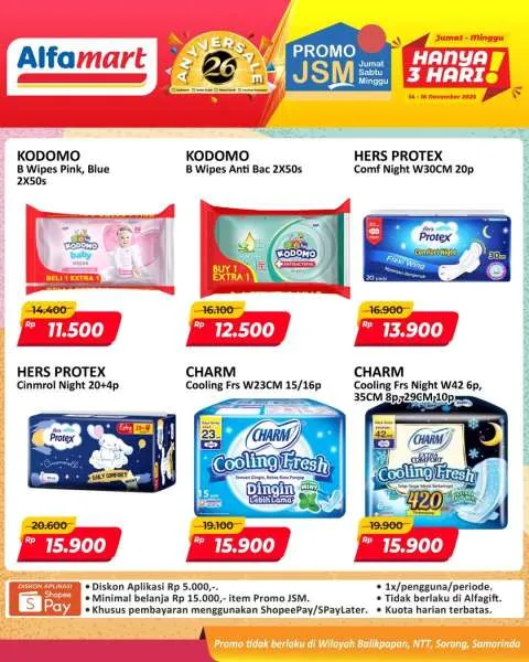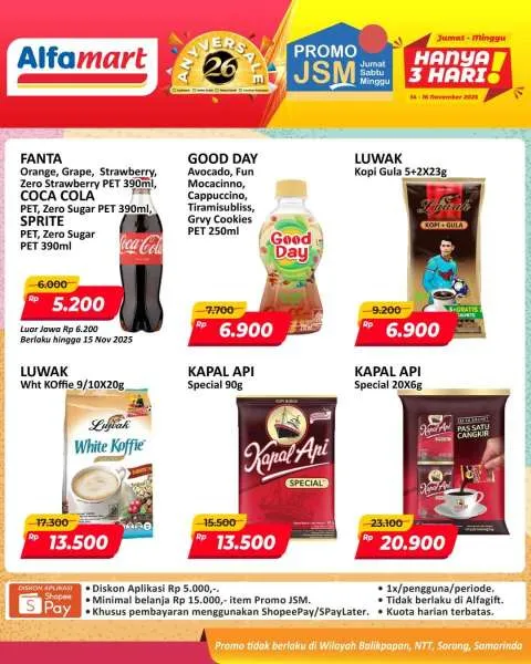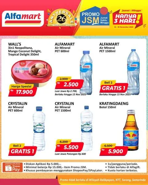 Harga promo JSM Alfamart periode 14-16 November 2025 tidak berlaku di wilayah NTT, Balikpapan, Samarinda, dan Sorong ya Moms.