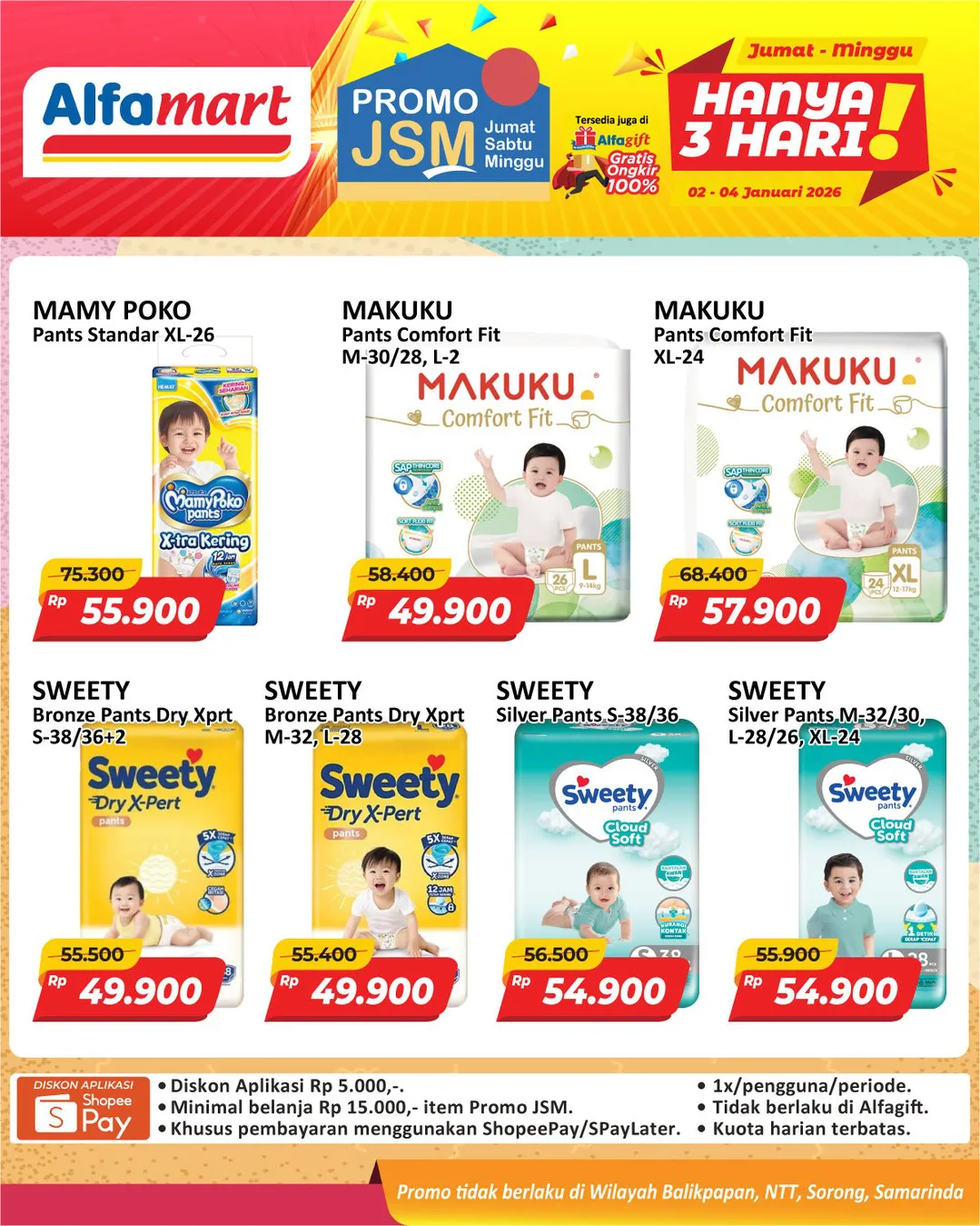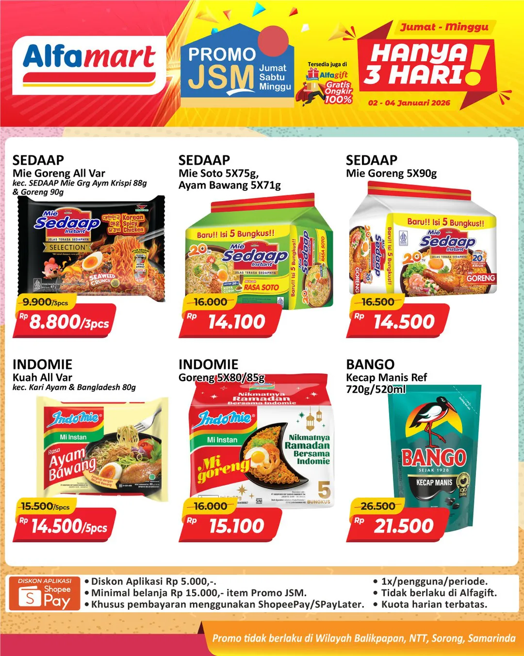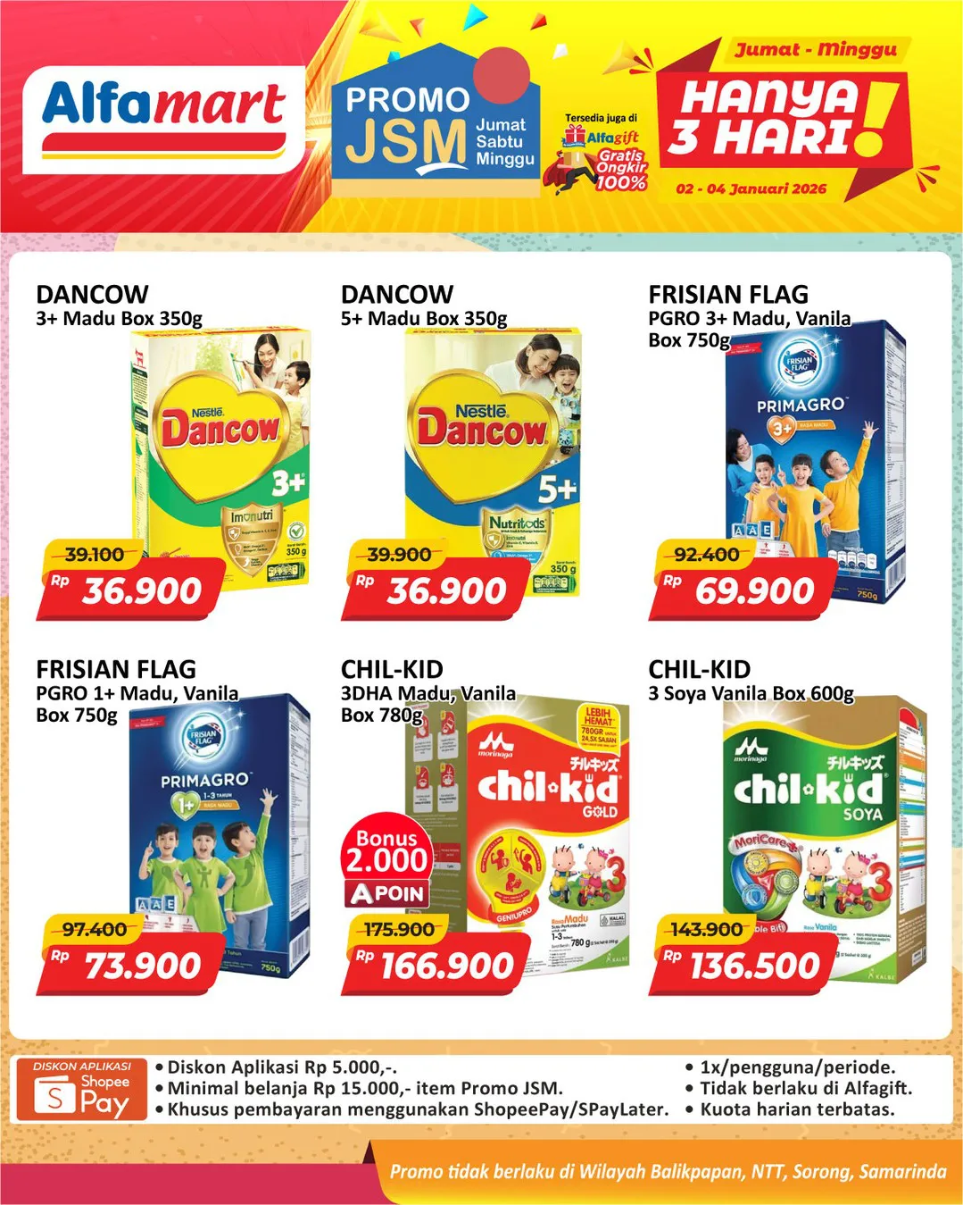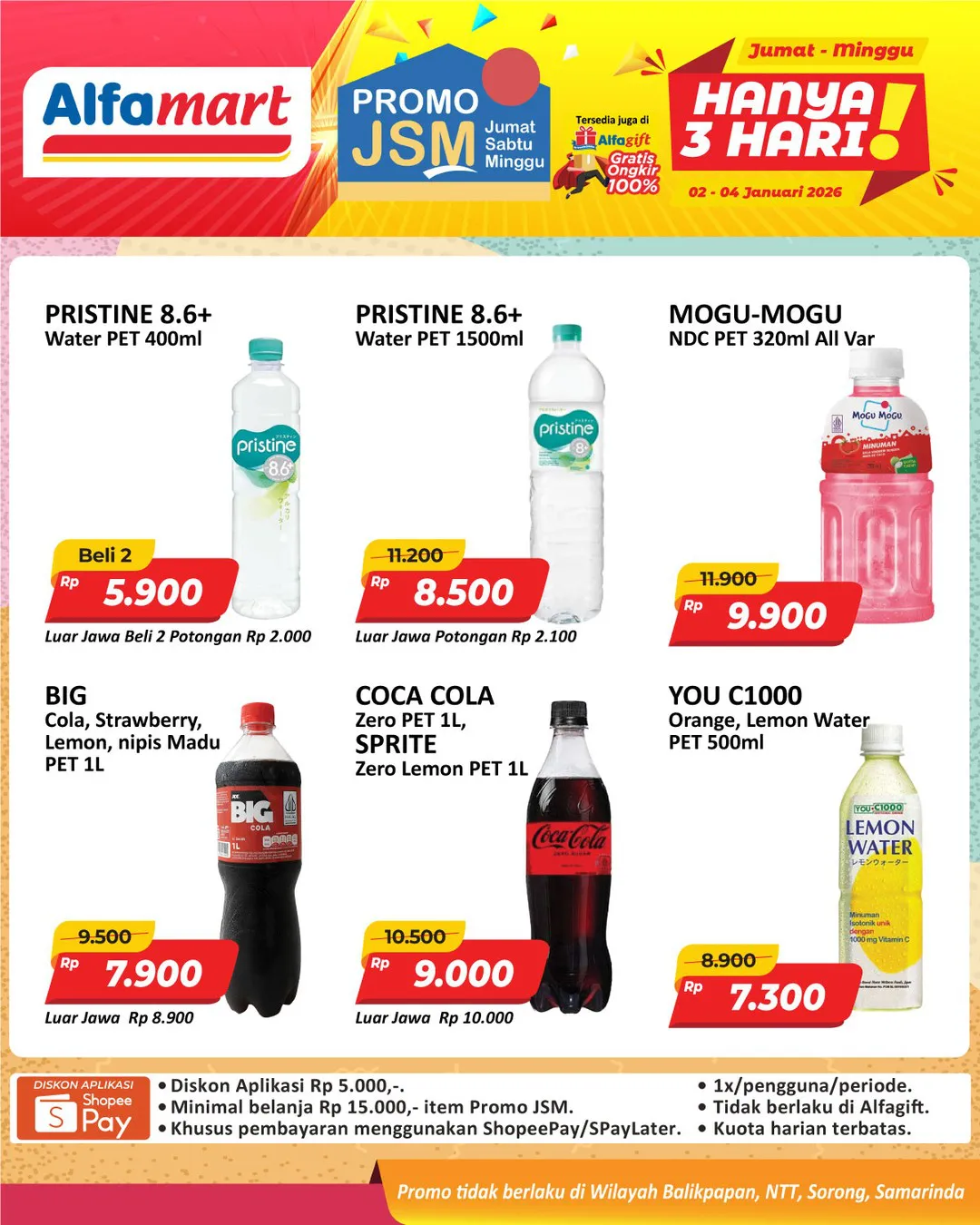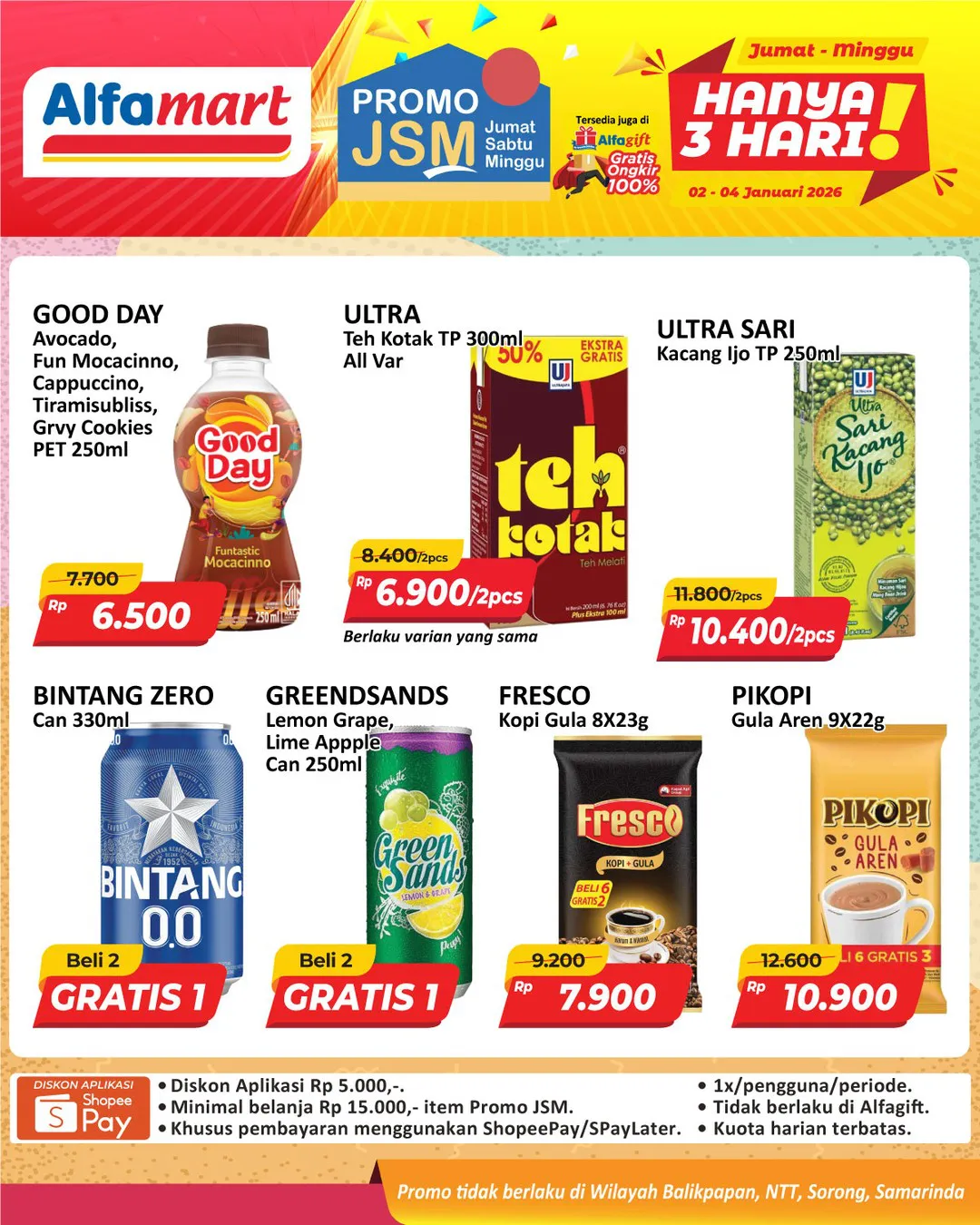 Harga promo JSM Alfamart periode 2-4 Januari 2026 tidak berlaku di wilayah NTT, Balikpapan, Samarinda, dan Sorong ya Moms.