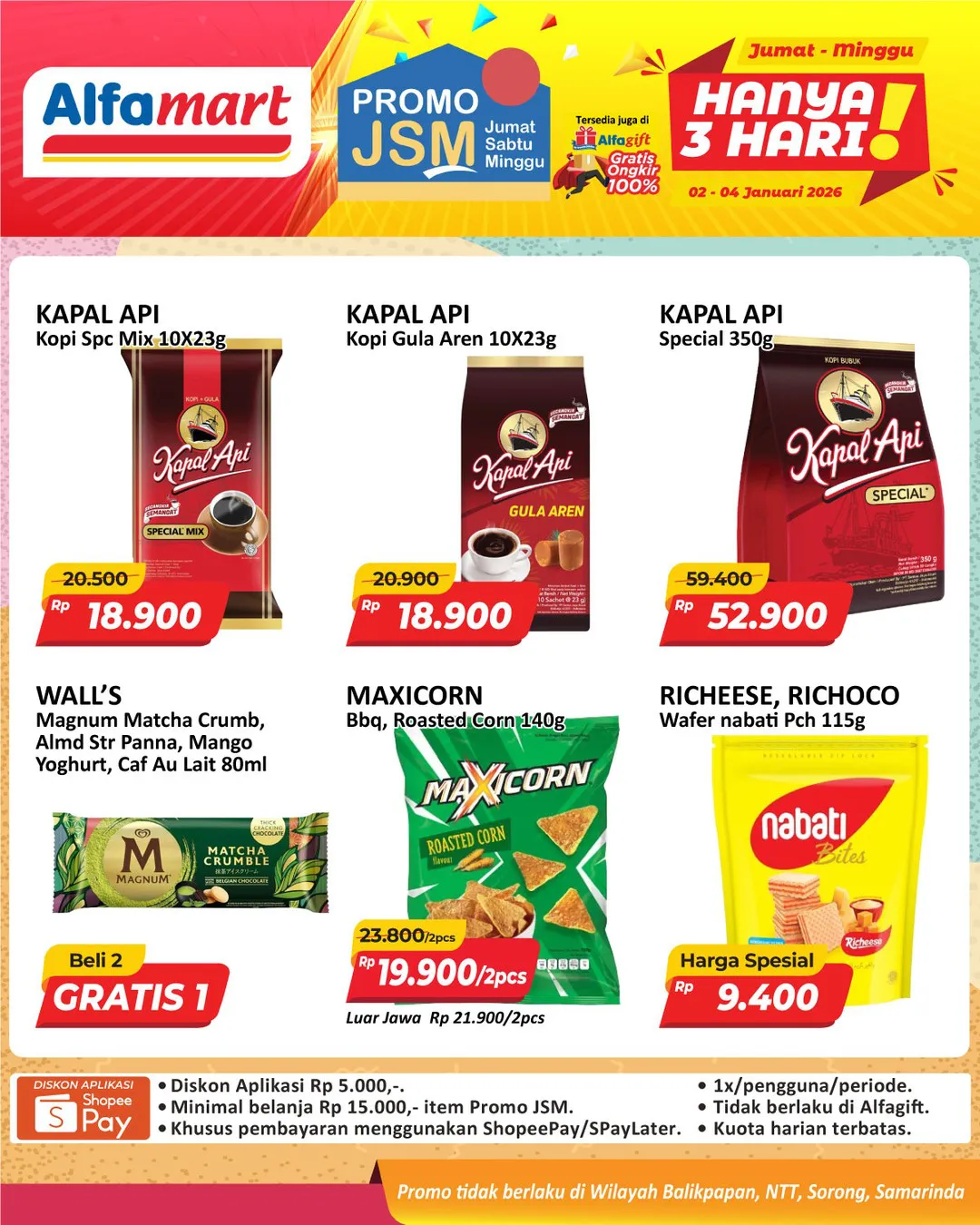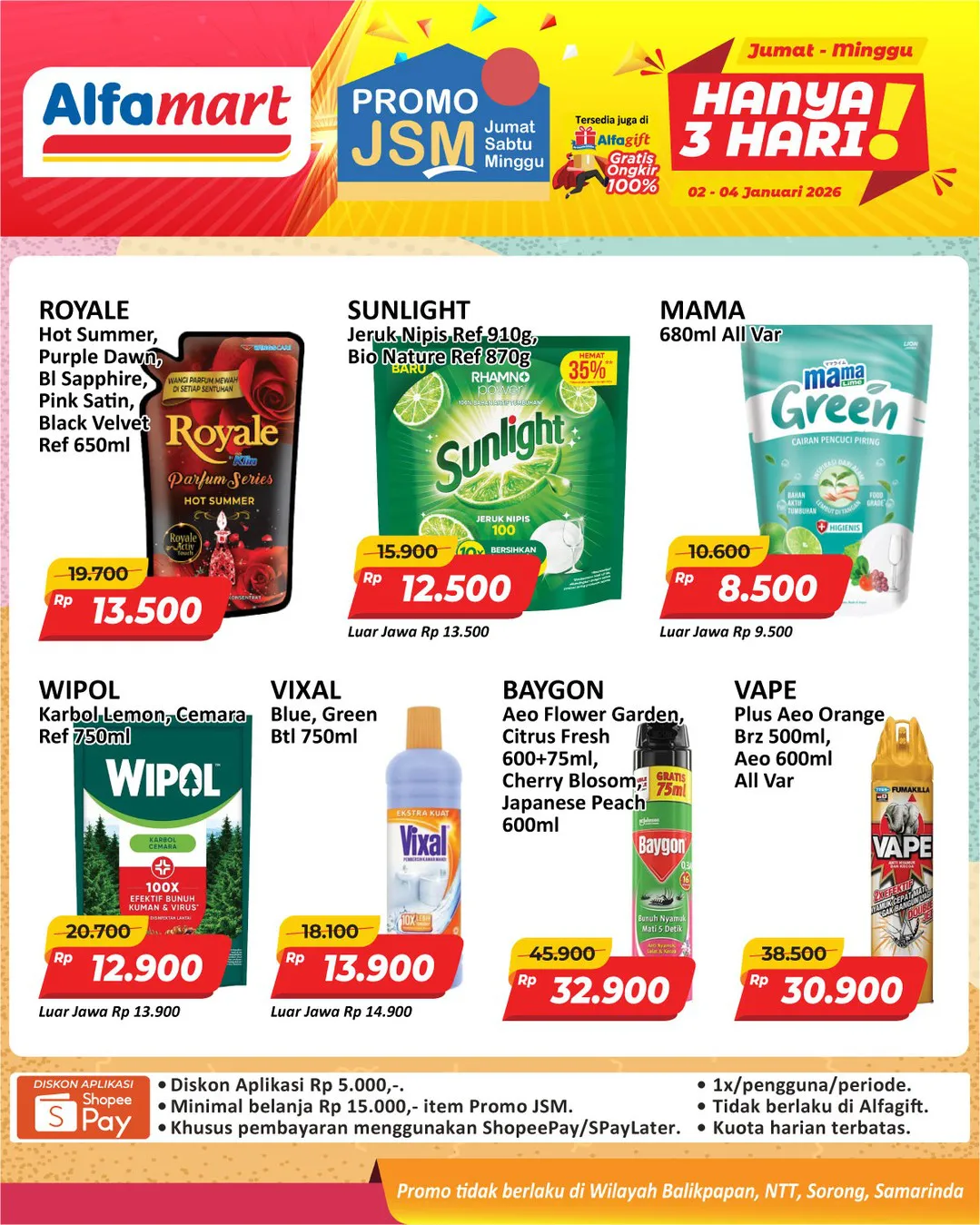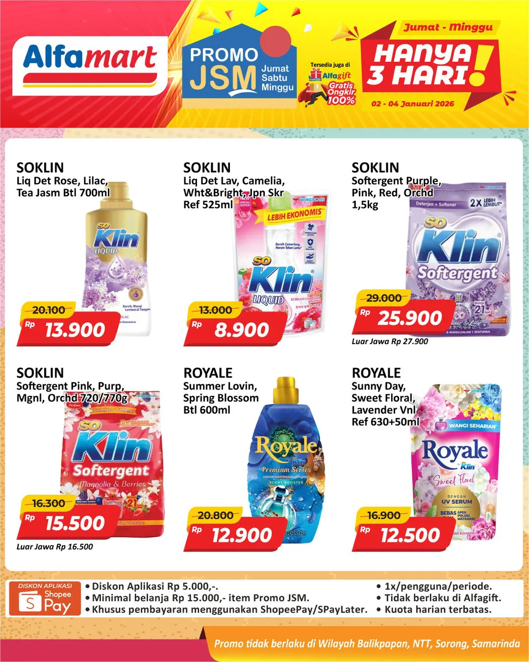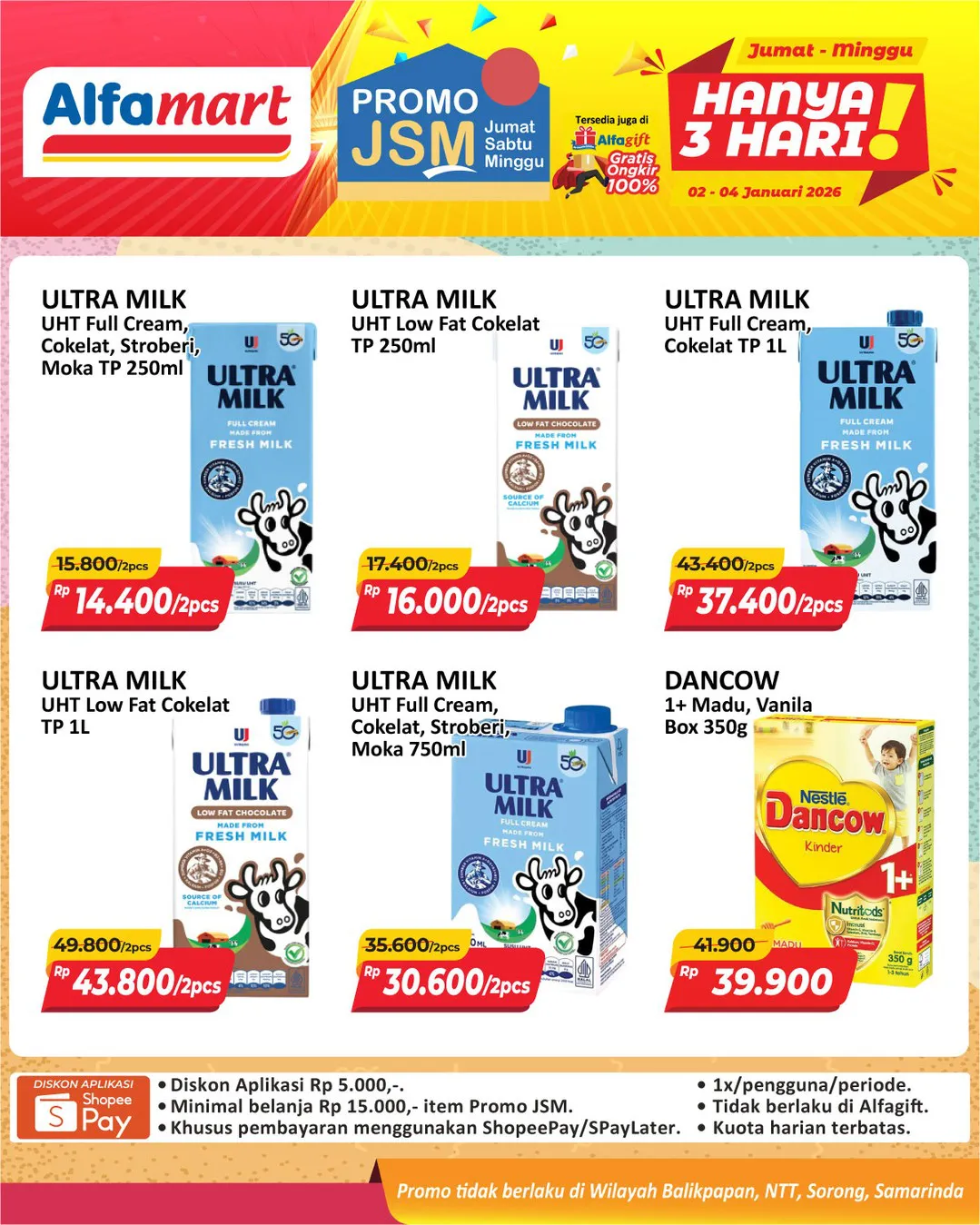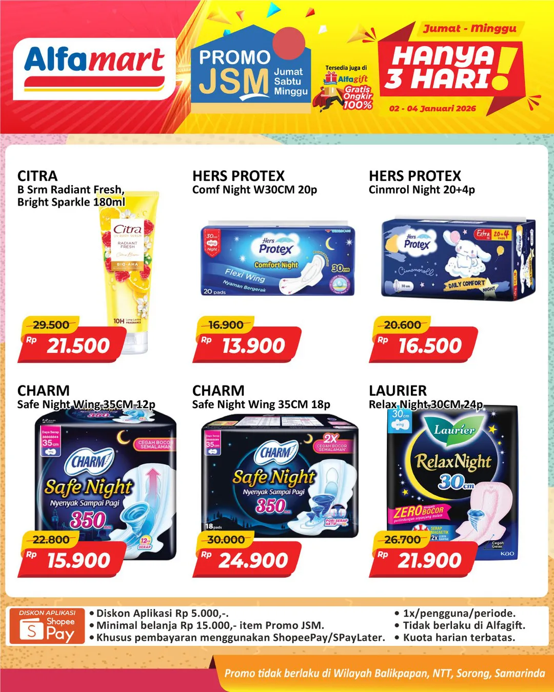 Harga promo JSM Alfamart periode 2-4 Januari 2026 tidak berlaku di wilayah NTT, Balikpapan, Samarinda, dan Sorong ya Moms.
