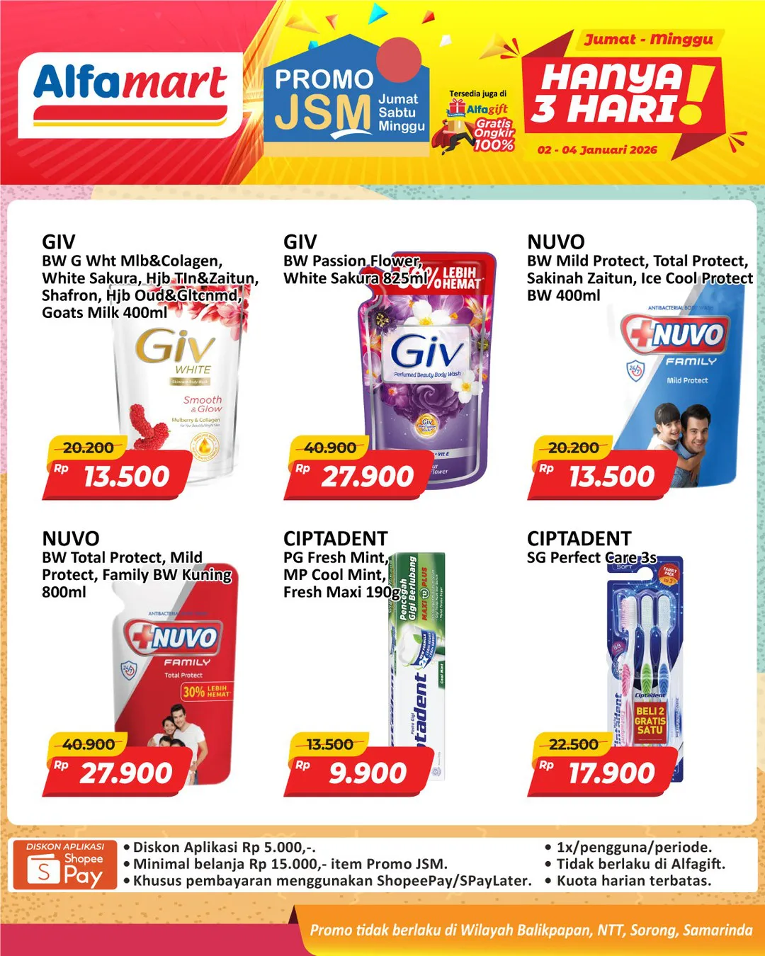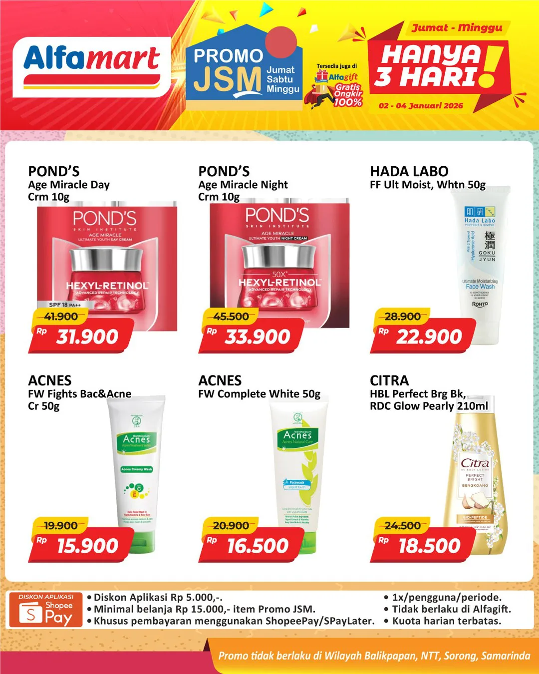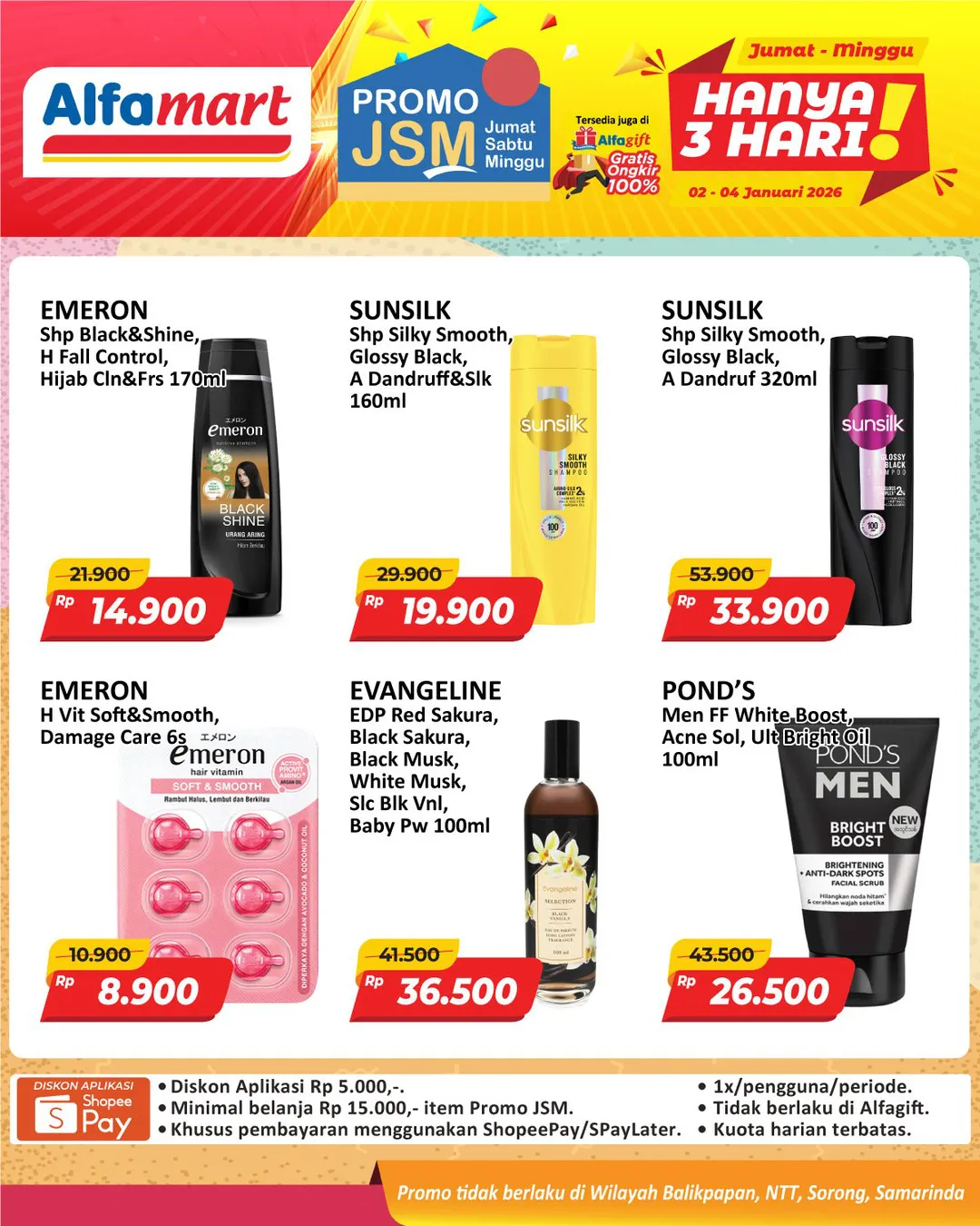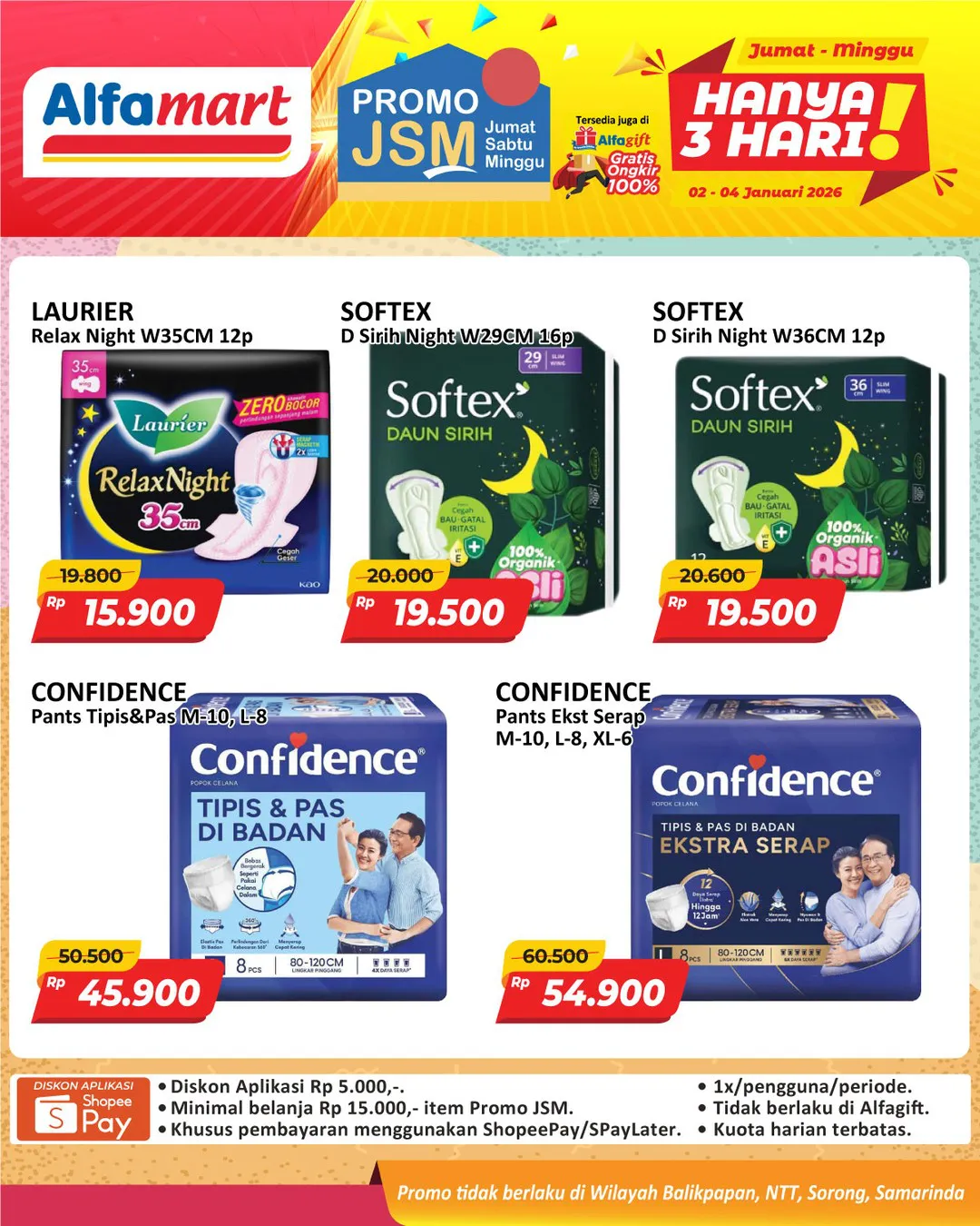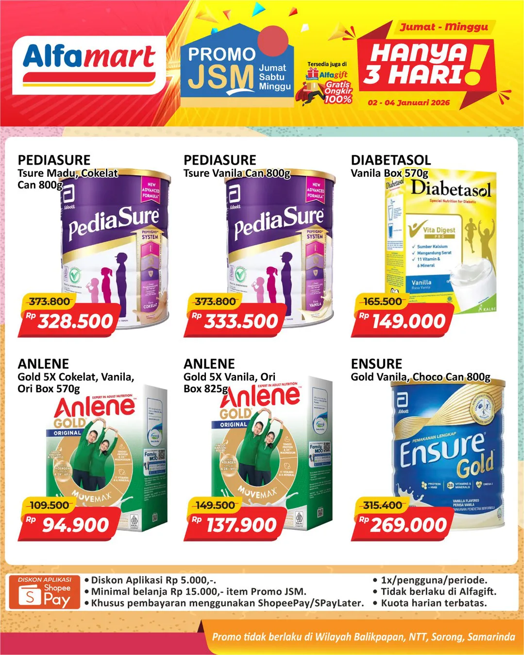 Harga promo JSM Alfamart periode 2-4 Januari 2026 tidak berlaku di wilayah NTT, Balikpapan, Samarinda, dan Sorong ya Moms.