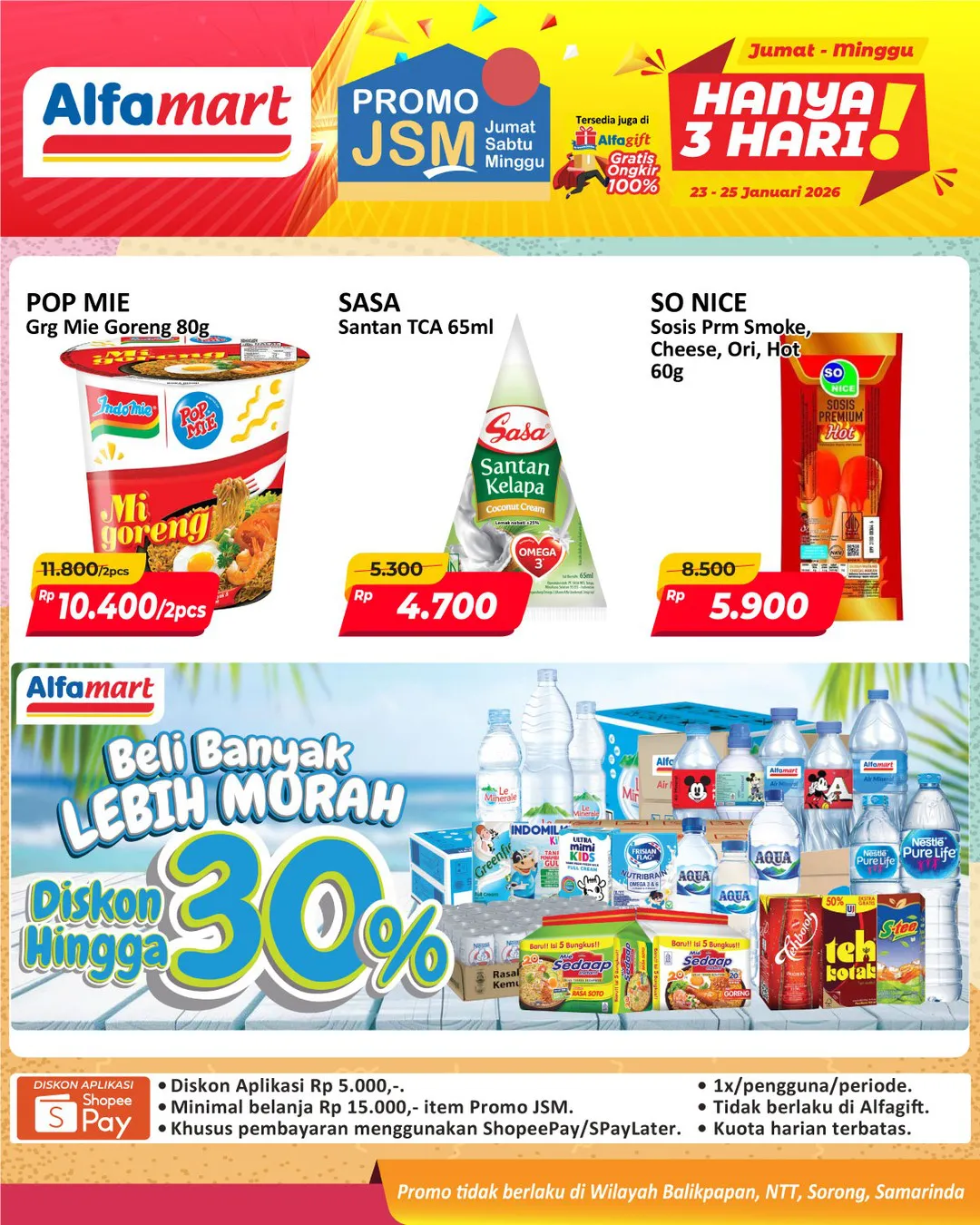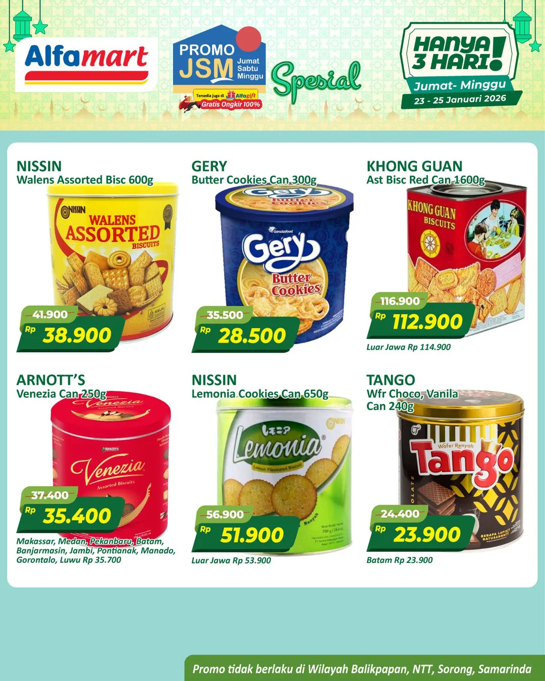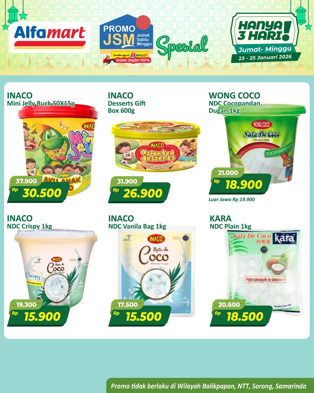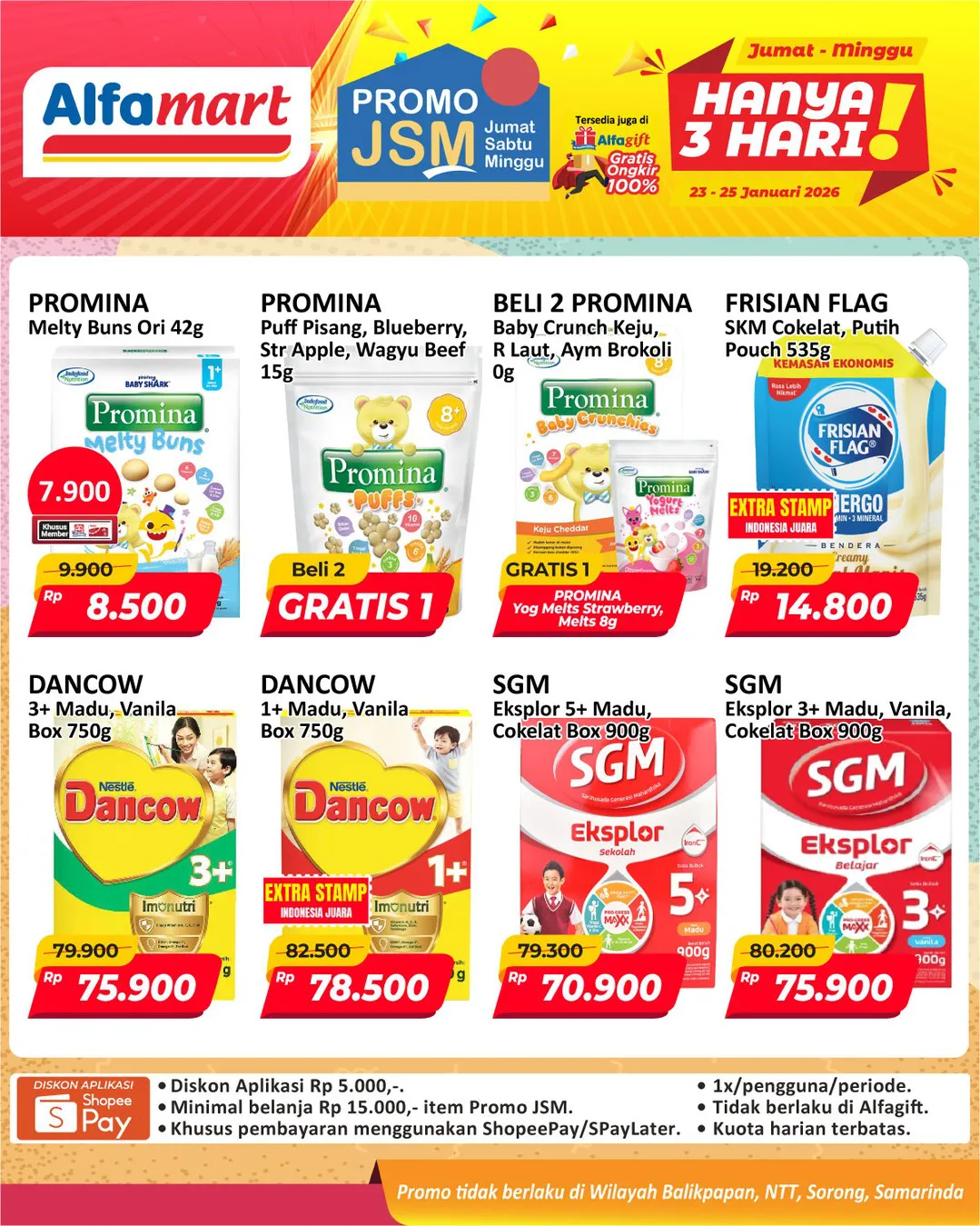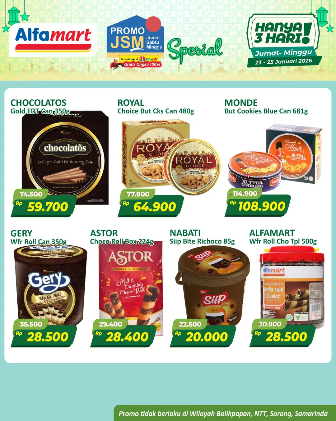 Harga promo JSM Alfamart periode 23-25 Januari 2026 tidak berlaku di wilayah NTT, Balikpapan, Samarinda, dan Sorong ya Moms.